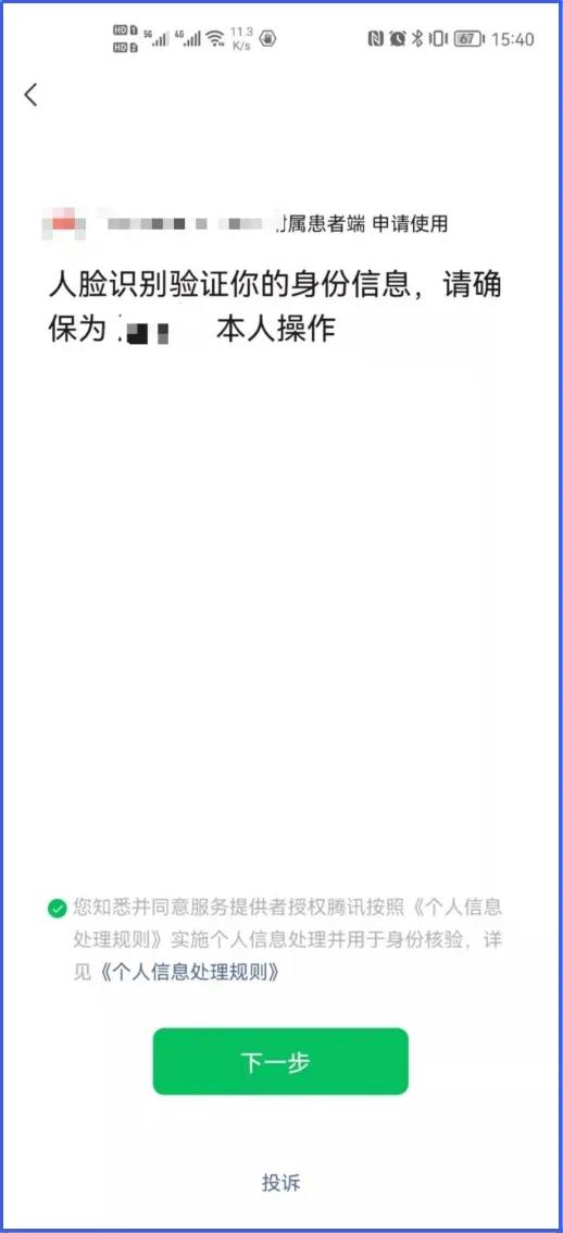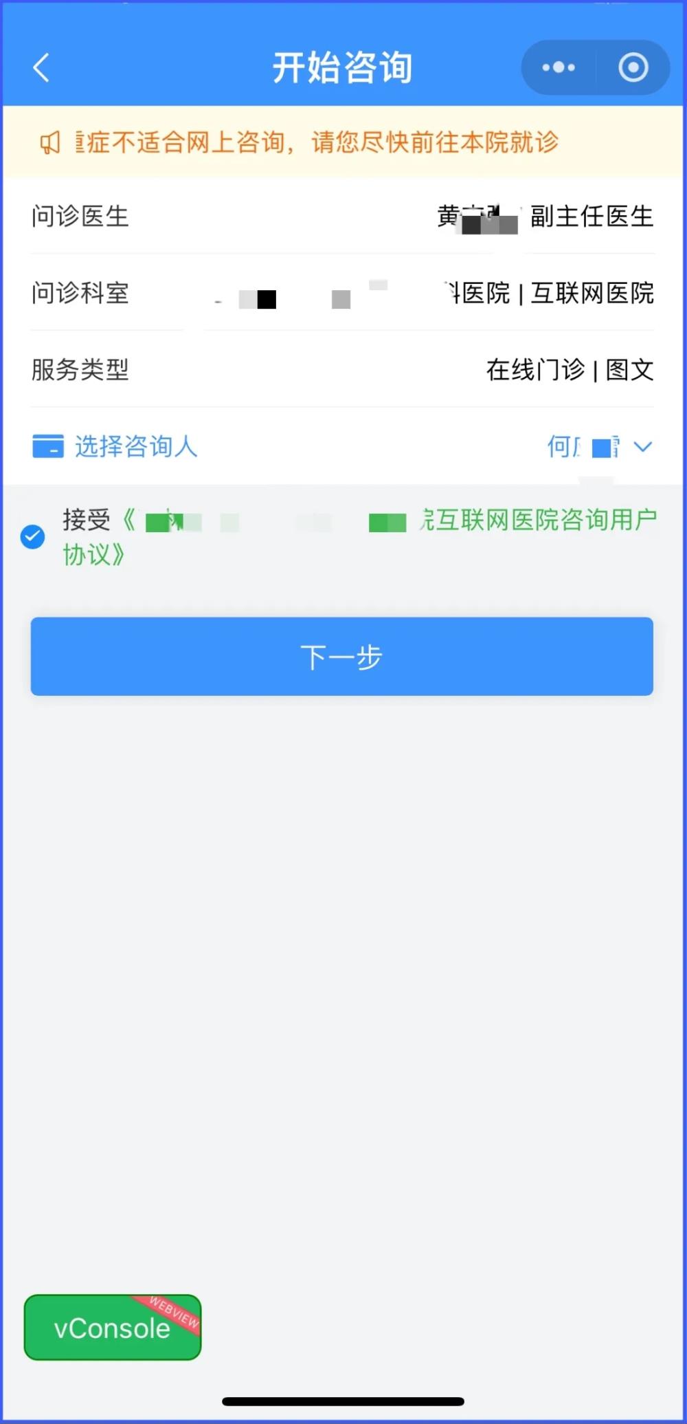③选择咨询人,点击接受《玉林市中西医结合骨科医院互联网医院咨询用户协议》,点击【下一步】