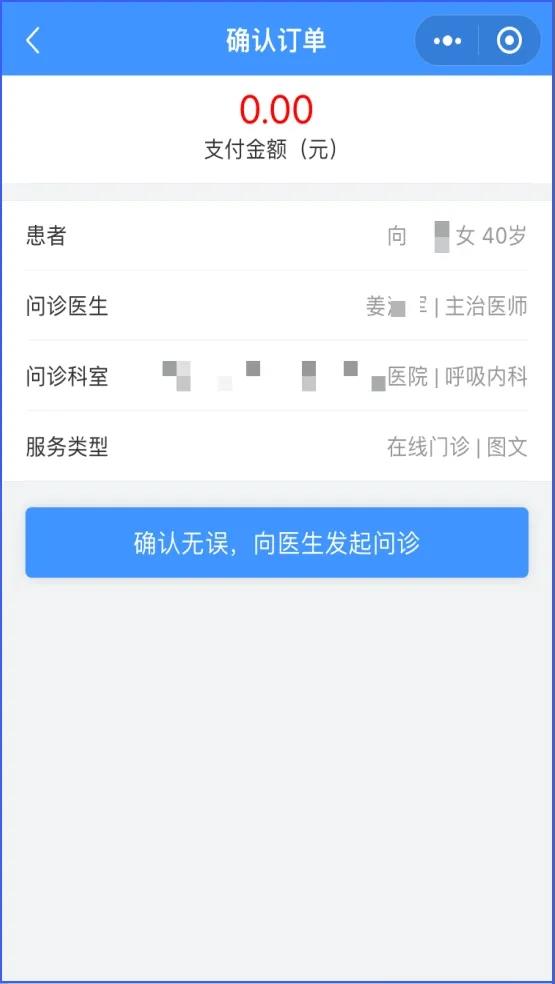 ④进入确认订单页面,确认无误,发起问诊(复诊)