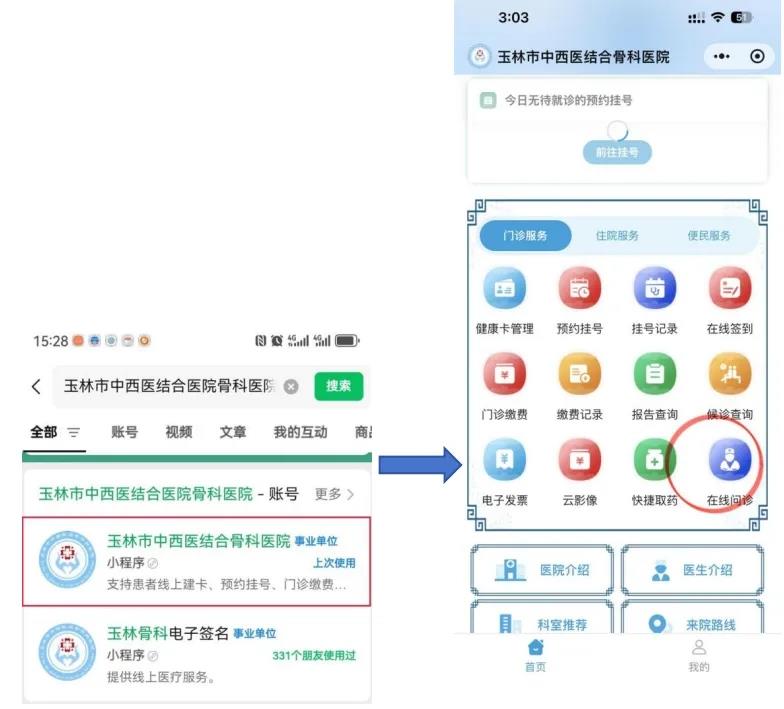 方法②:搜索微信小程序“玉林市中西医结合骨科医院”可直接进入。