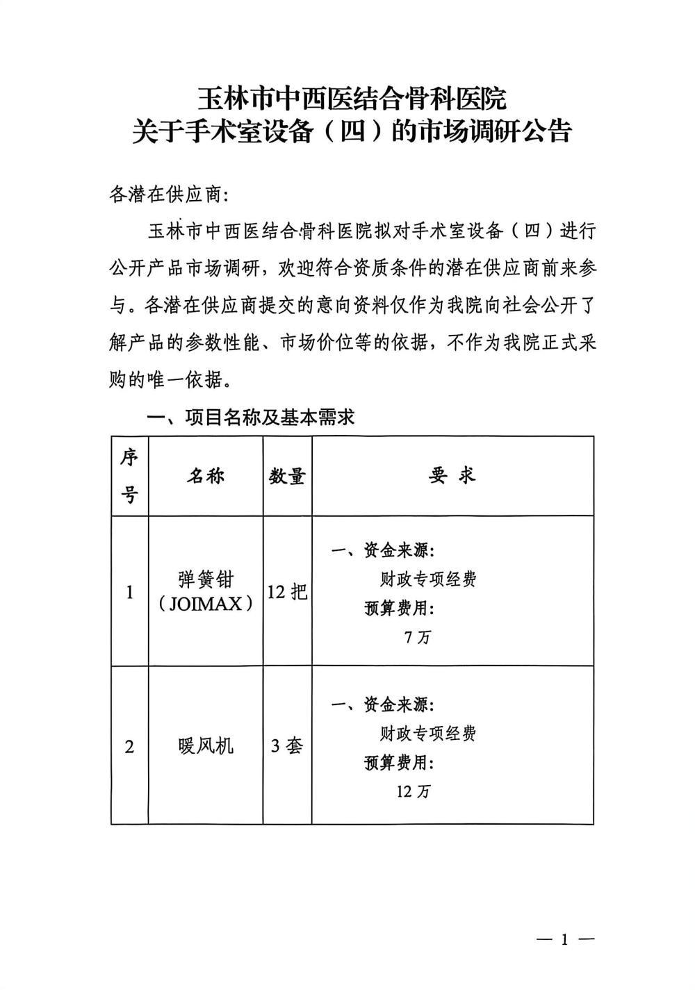 玉林市中西医结合骨科医院关于手术室设备(三)的市场调研公告