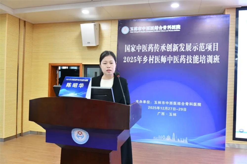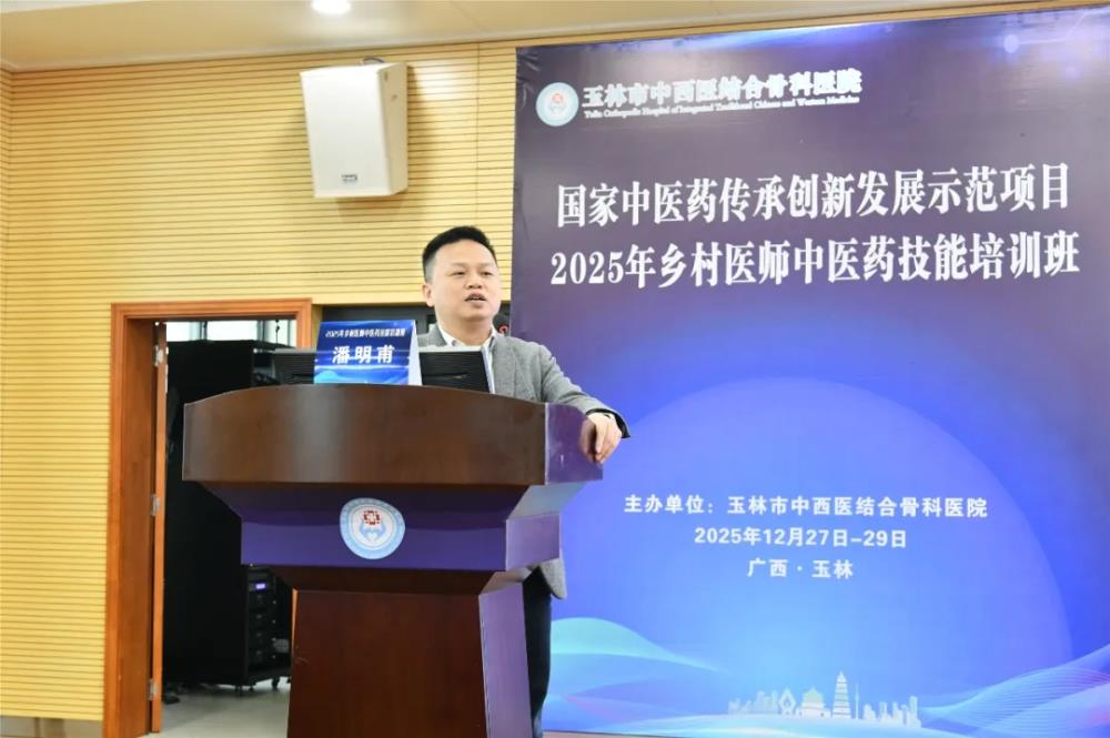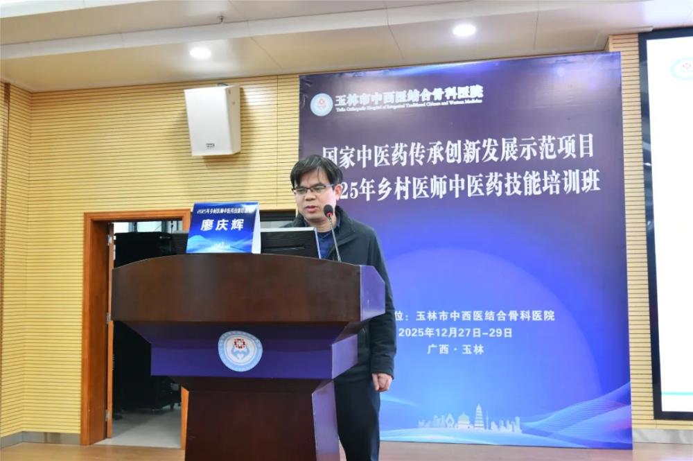在12月28日上午的开班仪式由玉林市中西医结合骨科医院副院长黄宗权主持,他代表主办方对参训学员的到来表示热烈欢迎,并详细介绍了本次培训的背景、课程设置及组织安排。他指出,本次培训是玉林市中医药传承创新发展示范项目“基层中医药人才提升”子项目的重要实践,旨在通过标准化、规范化培训,破解基层乡村医师中医药技能薄弱难题,让“简、便、廉、验”的中医药技术更好地服务乡村百姓。同时还着重强调了培训纪律要求,要求学员严格遵守中央八项规定精神及培训管理制度,珍惜学习机会,做到学以致用。
