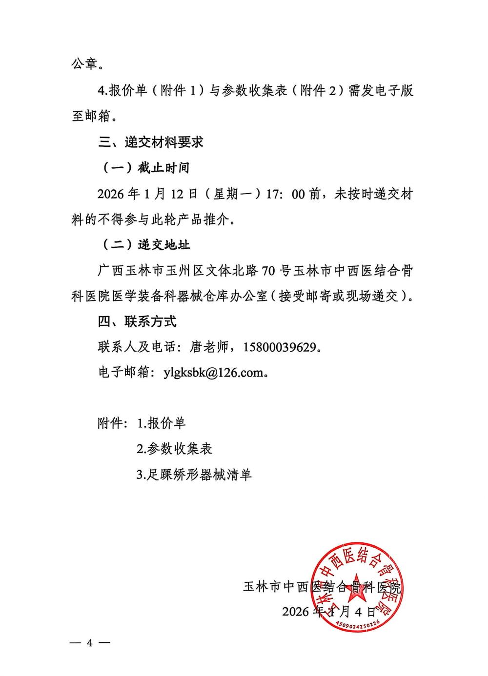 玉林市中西医结合骨科医院关于足踝一科设备的市场调研公告