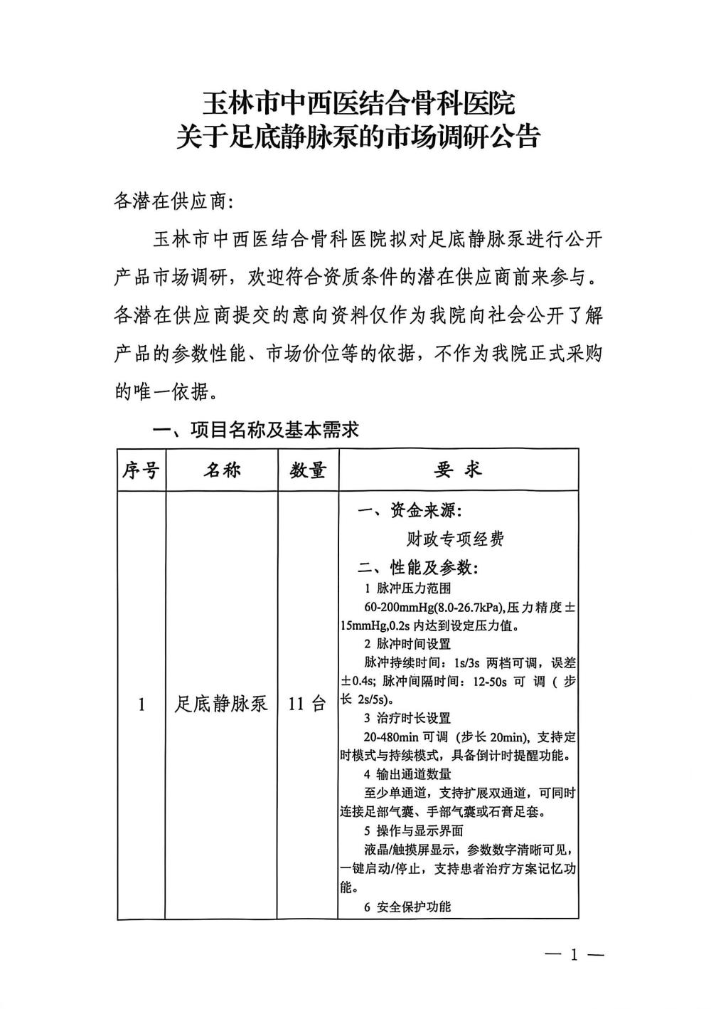 玉林市中西医结合骨科医院关于足底静脉泵的市场调研公告