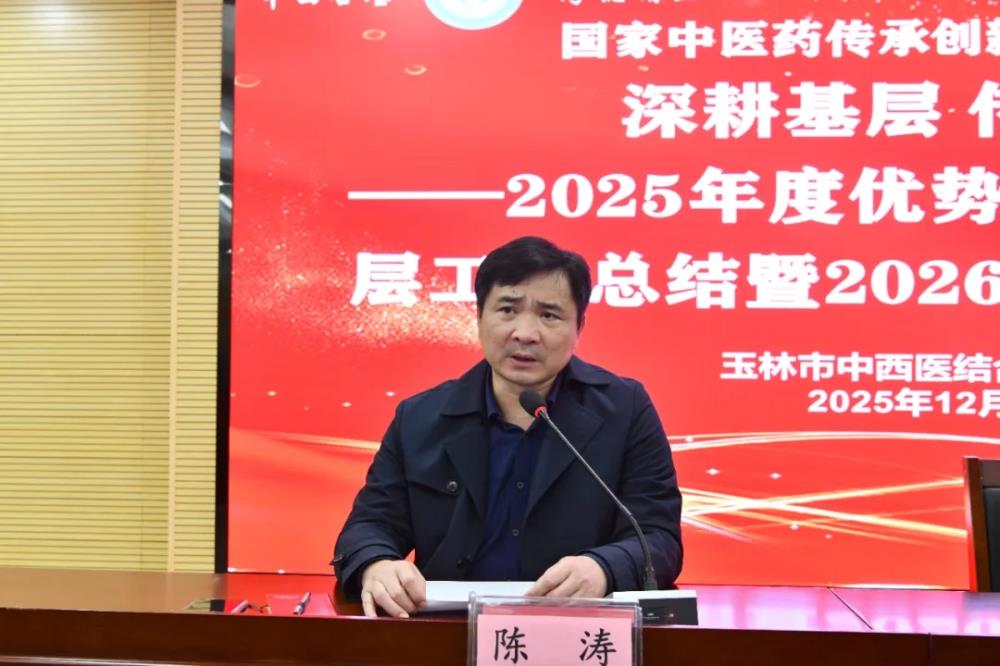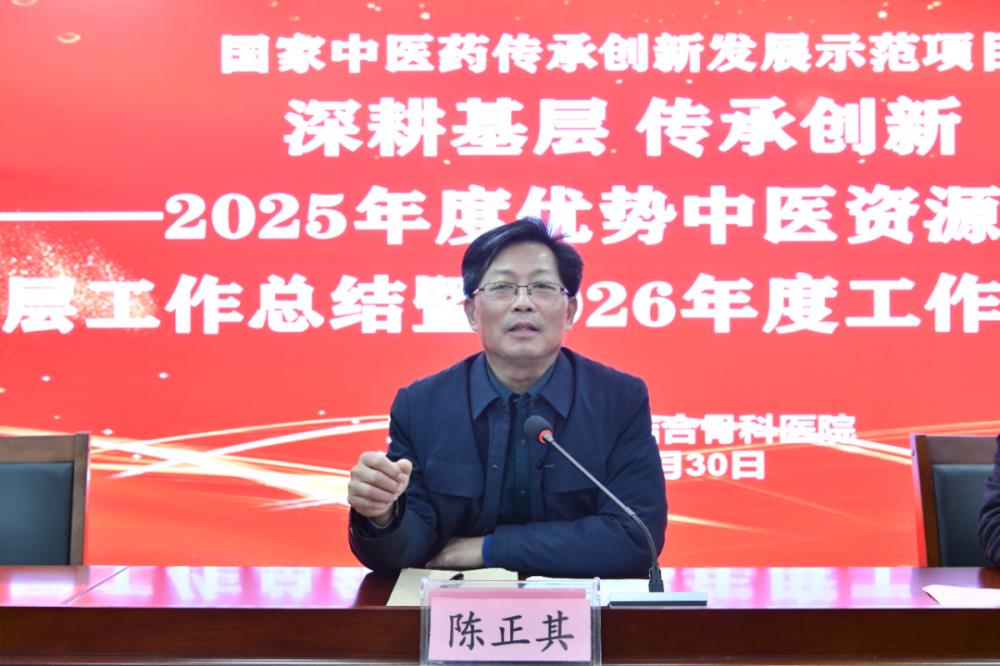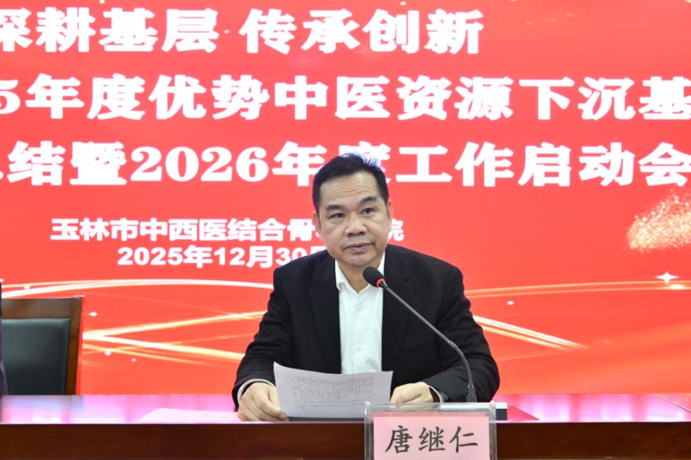 为深入贯彻国家“推动优质中医医疗资源下沉”的战略部署,扎实推进国家中医药传承创新发展示范项目建设,玉林市中西医结合骨科医院每年持续派出大量医务人员深入基层,助力基层中医药传承与发展。为系统总结年度工作成效,科学谋划下一年度重点任务,12月30日,医院以“深耕基层 传承创新”为主题,召开2025年度优势中医资源下沉基层工作总结暨2026年度工作启动会议。医院党委书记陈正其主持会议,院长唐继仁出席会议并讲话,副院长陈涛作年度工作报告,医务部对2026年工作做具体部署。