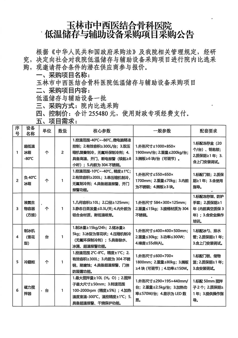 玉林市中西医结合骨科医院低温储存与辅助设备采购项目采购公告