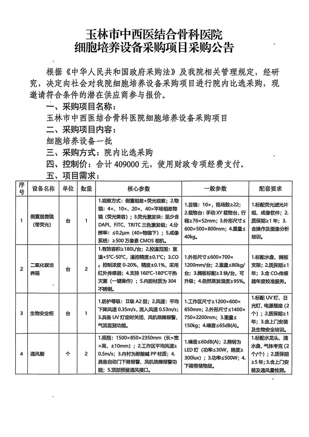 玉林市中西医结合骨科医院细胞培养设备采购项目采购公告