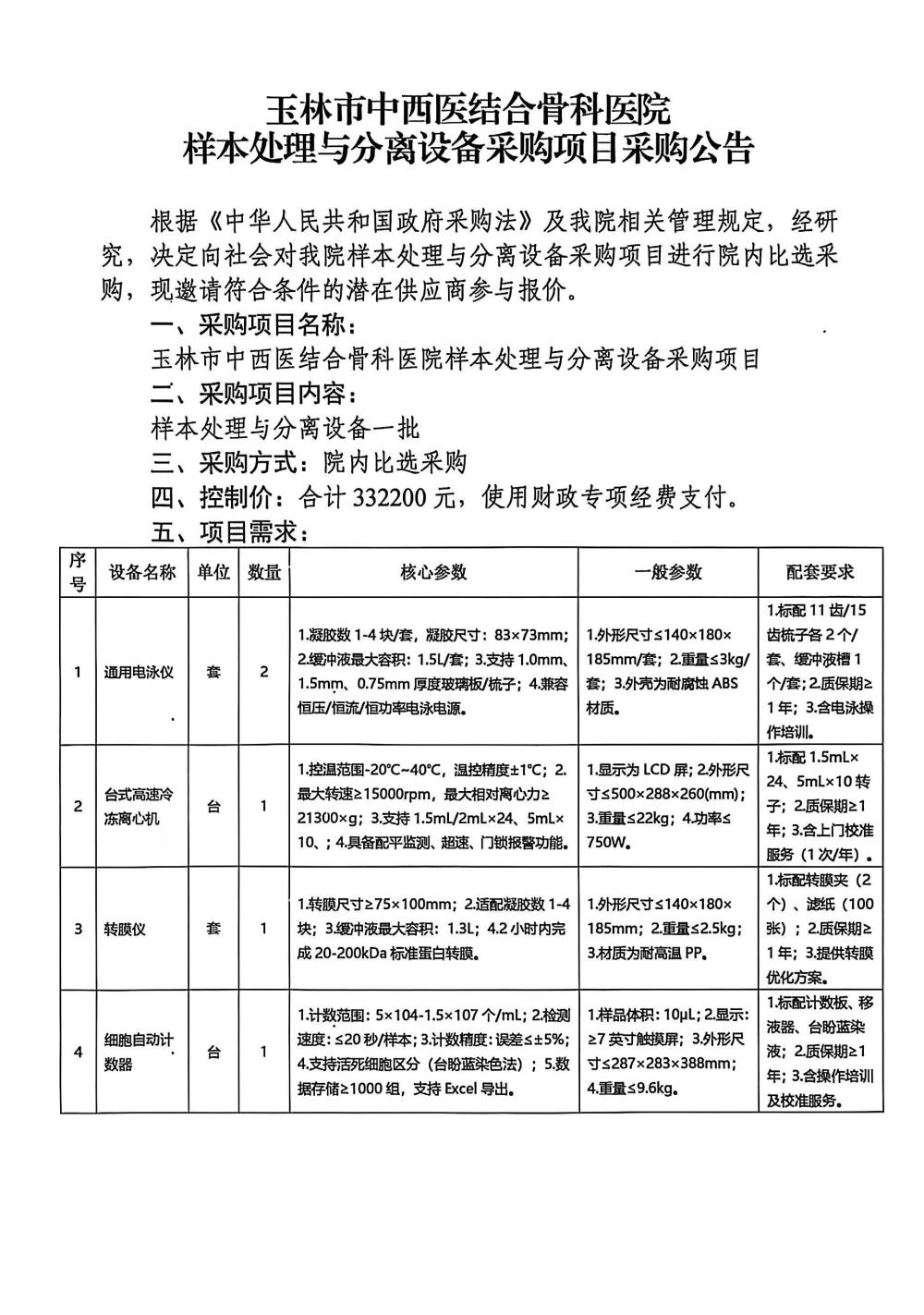 玉林市中西医结合骨科医院样本处理与分离设备采购项目采购公告