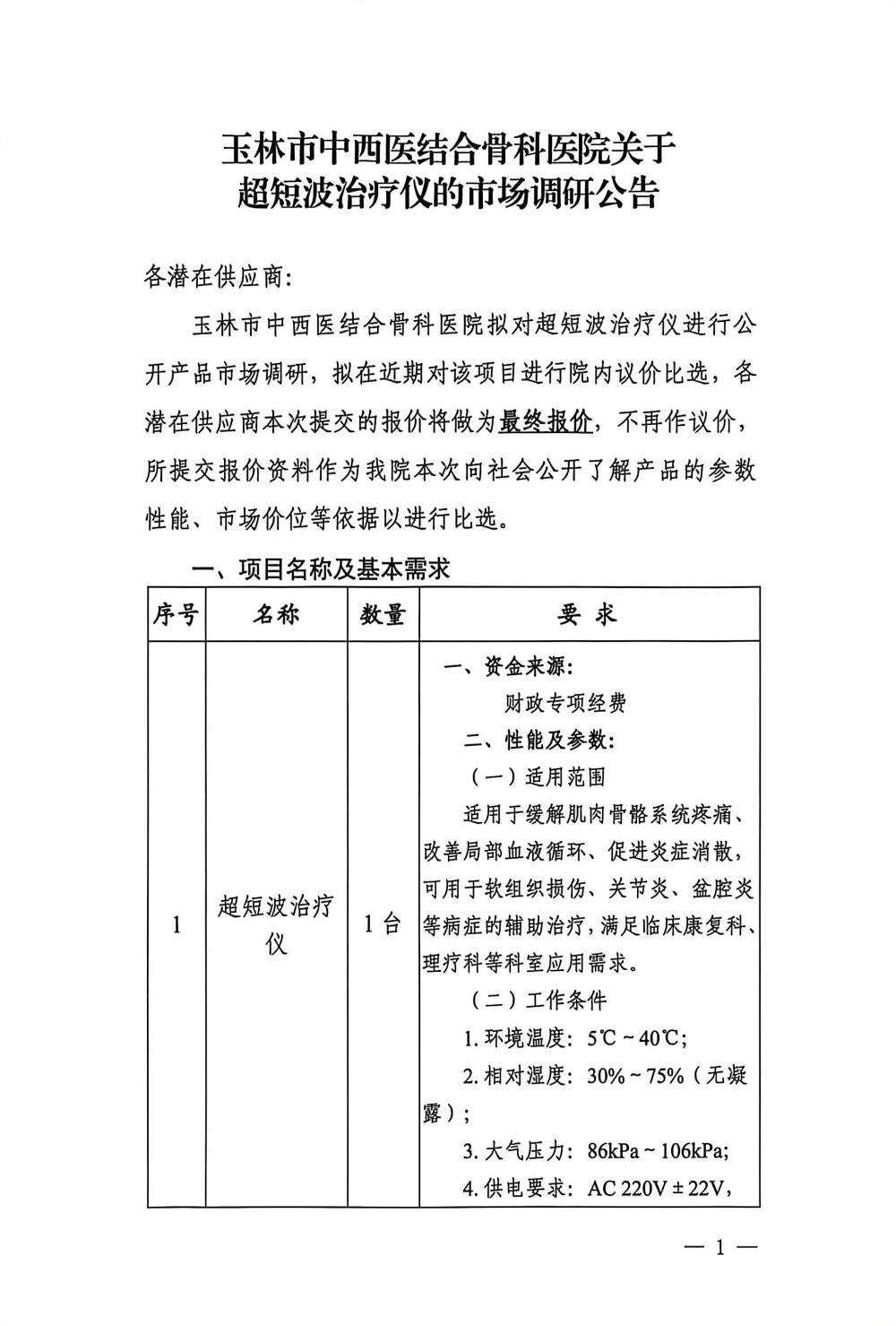 玉林市中西医结合骨科医院关于超短波治疗仪的市场调研公告
