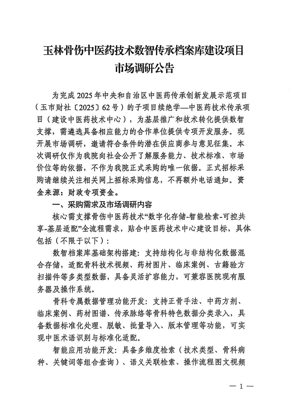 玉林骨伤中医药技术数智传承档案库建设项目市场调研公告