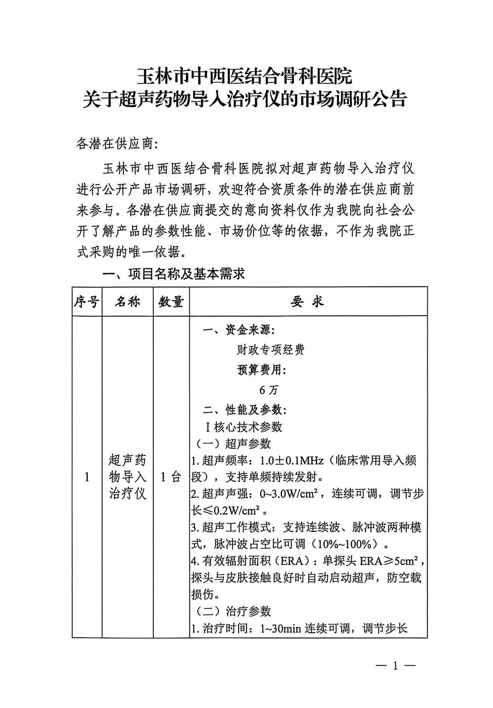 玉林市中西医结合骨科医院关于超声药物导入治疗仪的市场调研公告
