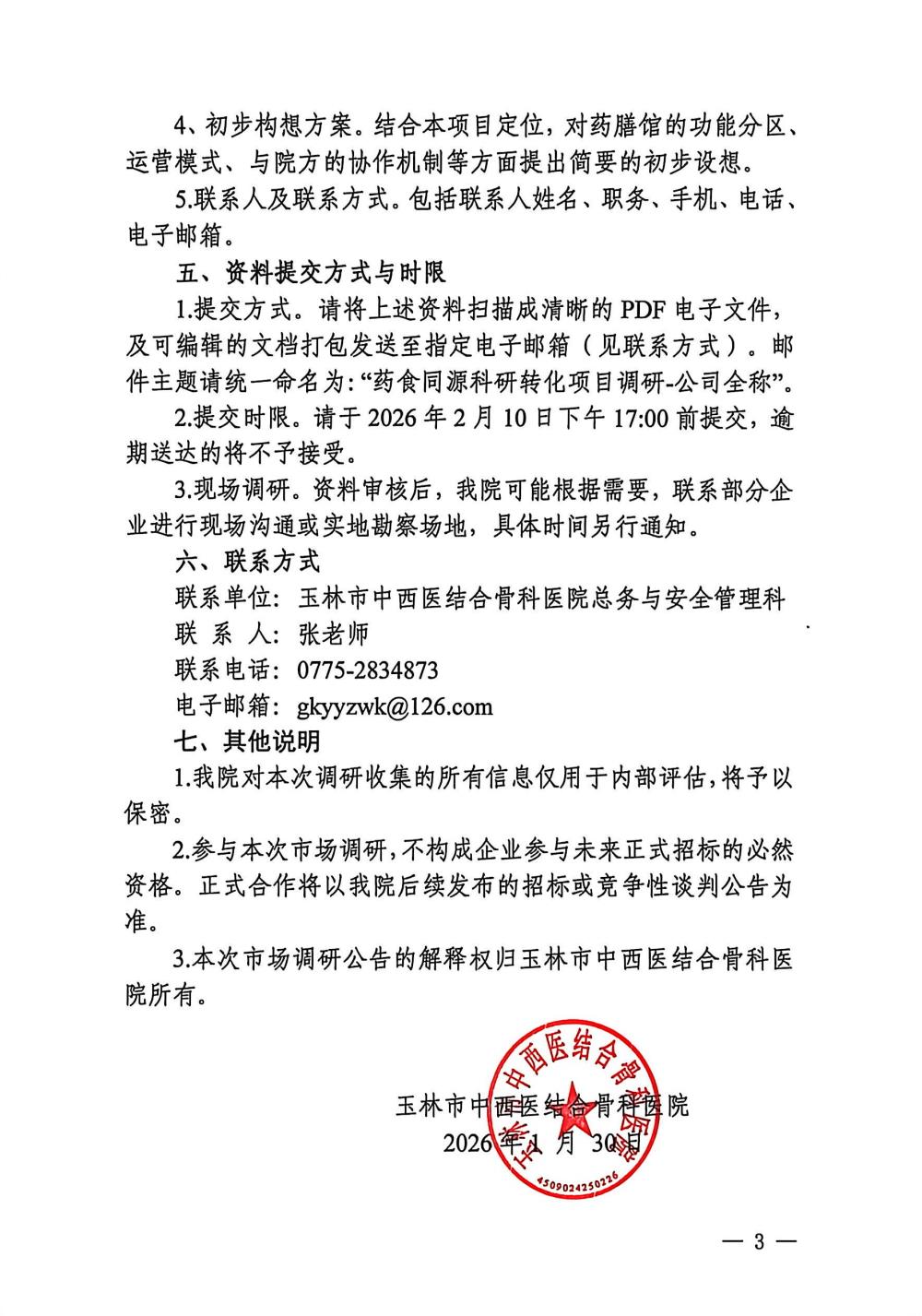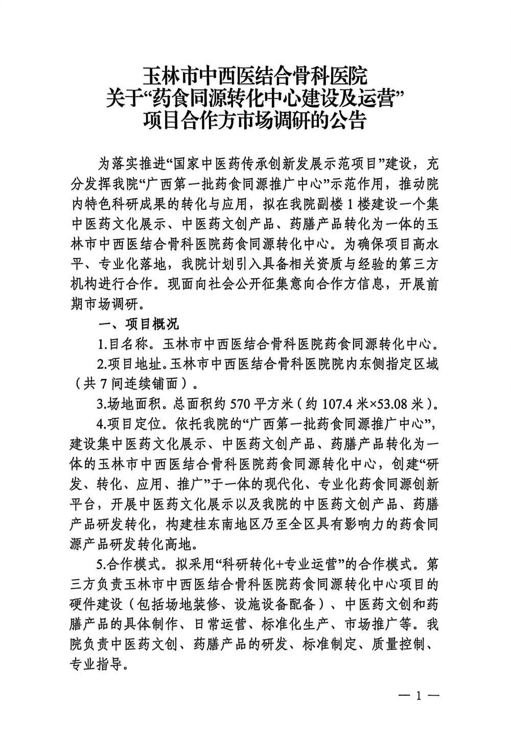 玉林市中西医结合骨科医院关于“药食同源转化中心建设及运营” 项目合作方市场调研的公告