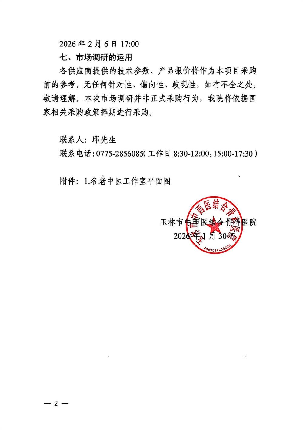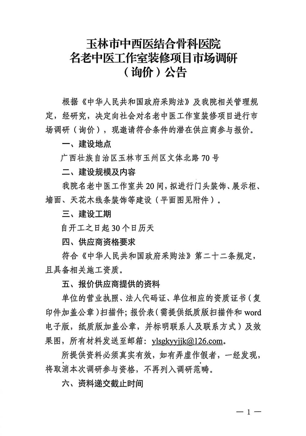 玉林市中西医结合骨科医院名老中医工作室装修项目市场调研(询价)公告