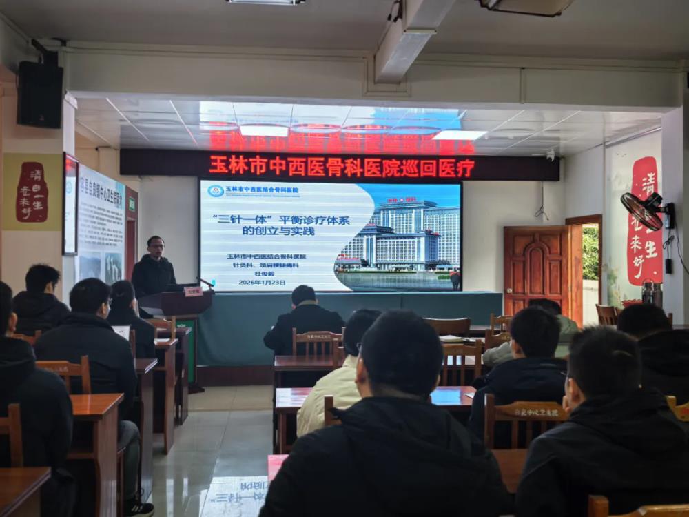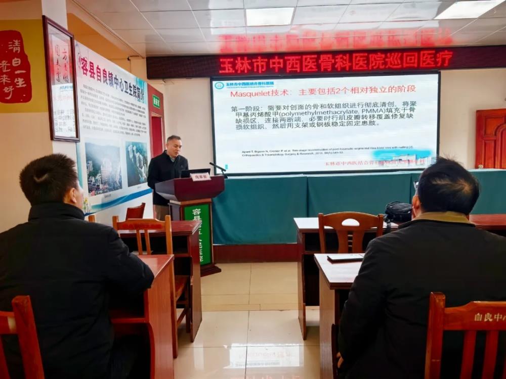 在学术讲座环节,专家们带来了紧密贴合基层需求的专题分享。韦进强副主任医师围绕《活络壮骨法联合Ilizarov外固定技术治疗胫骨骨折术后骨不连骨缺损的临床研究》开展适宜技术推广;庞家省主任讲解了《骨髓炎长段骨缺损的治疗》与《人工髋关节置换术后感染翻修》;杜俊毅主任分享了《“三针一体”平衡诊疗体系的创立与实践》。讲座内容深入浅出,实用性强,随后还进行了中医治疗操作教学展示,为基层医务人员拓宽了专业视野,输送了新技术、新理念。