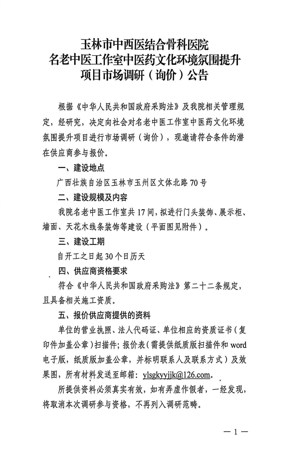 玉林市中西医结合骨科医院名老中医工作室中医药文化环境氛围提升项目市场调研(询价)公告