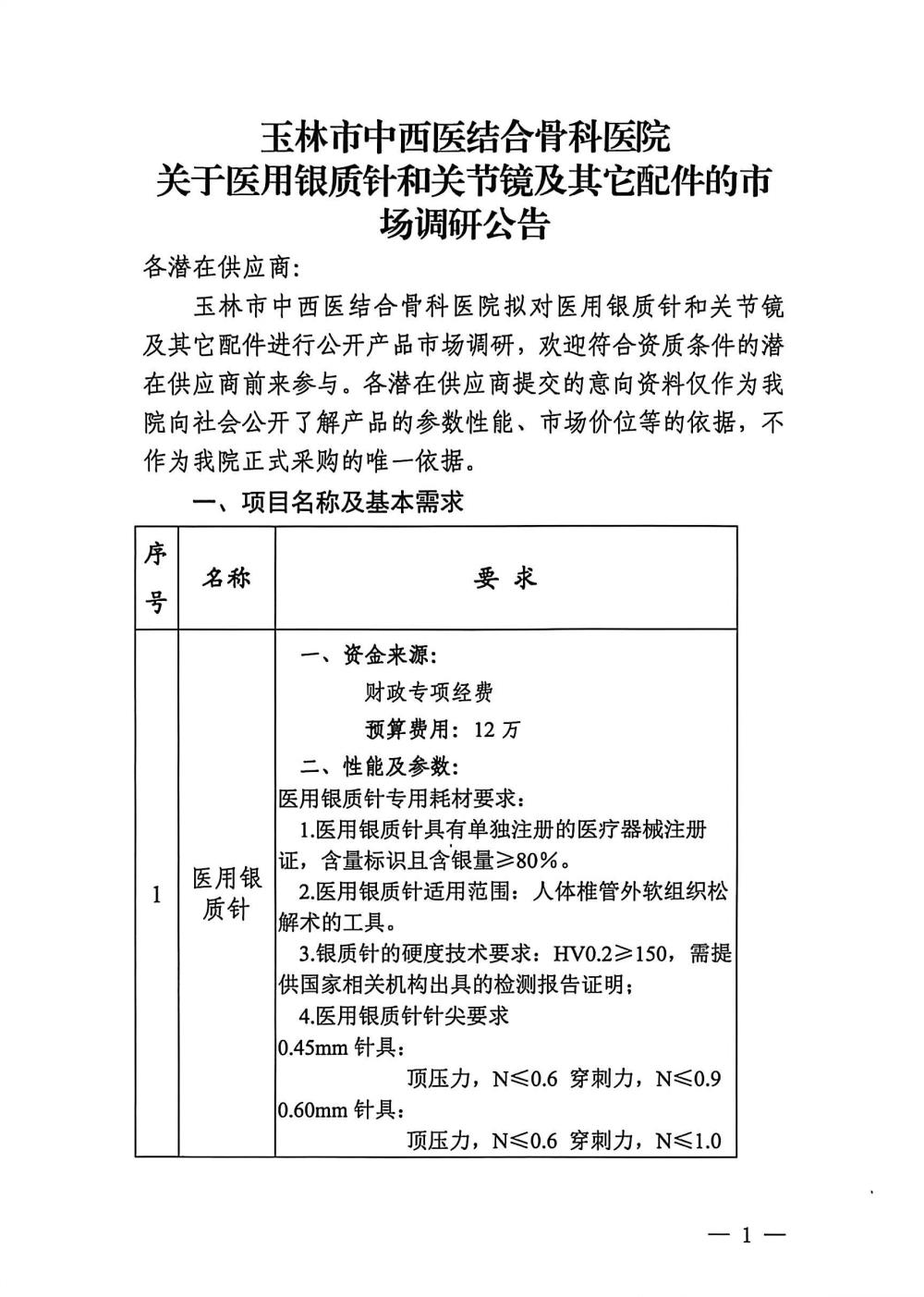 玉林市中西医结合骨科医院关于医用银质针和关节镜及其它配件的市场调研公告