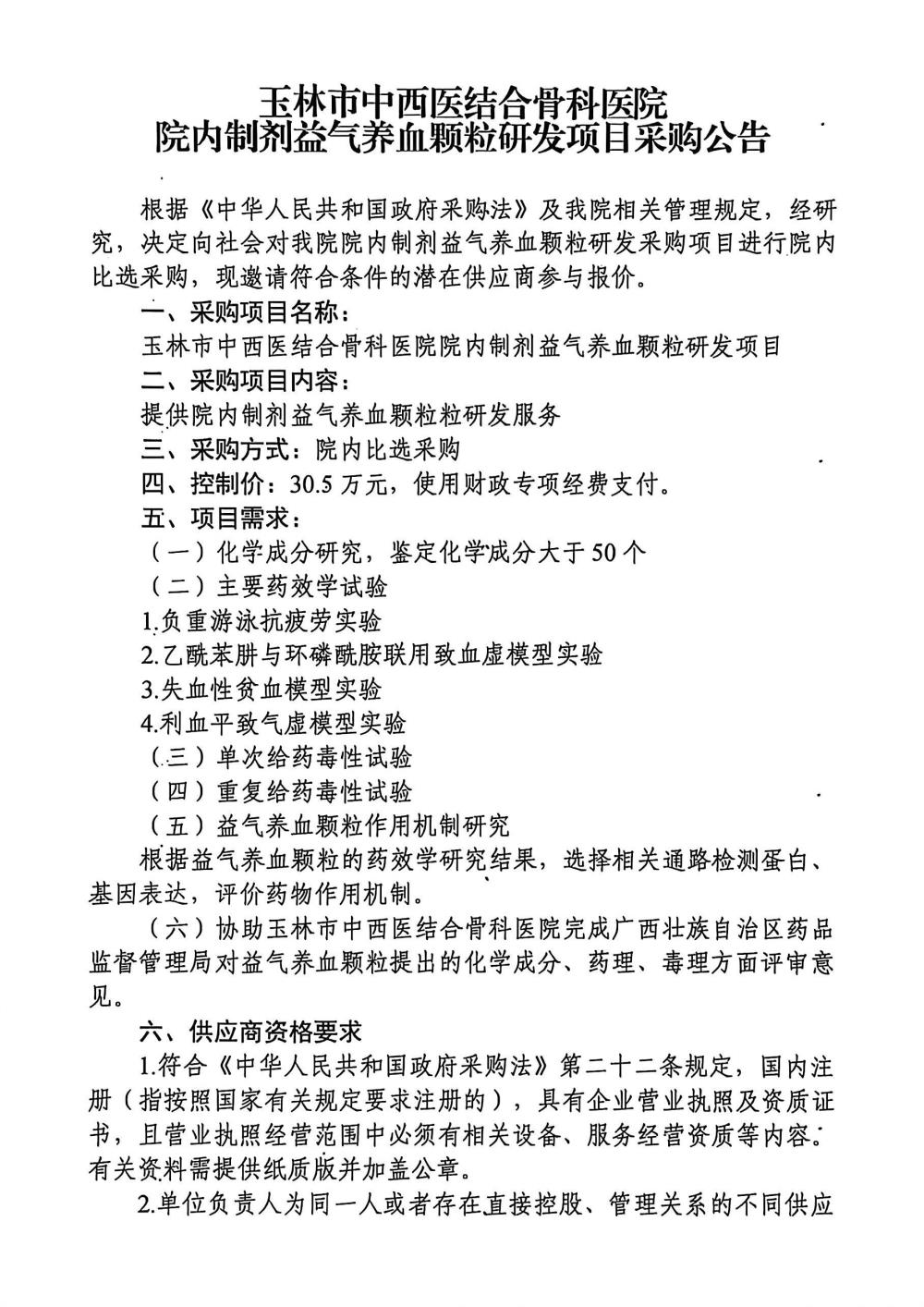 玉林市中西医结合骨科医院院内制剂益气养血颗粒研发项目采购公告