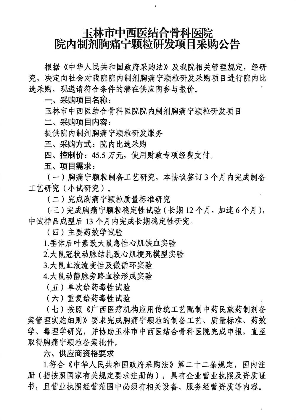 玉林市中西医结合骨科医院院内制剂胸痛宁颗粒研发项目采购公告