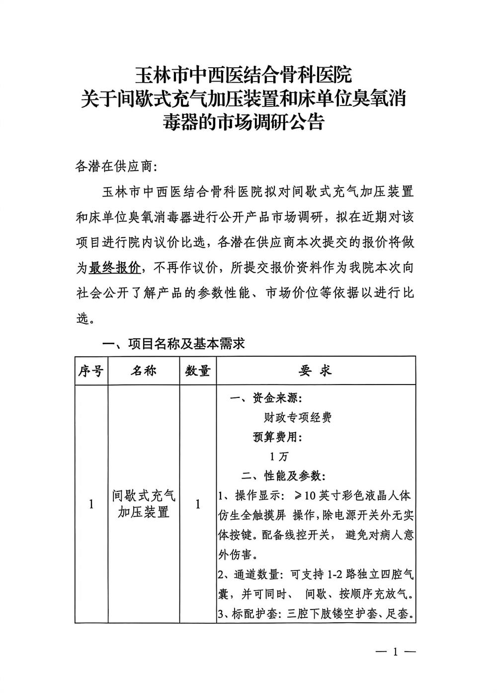玉林市中西医结合骨科医院关于间歇式充气加压装置和床单位臭氧消毒器的市场调研公告