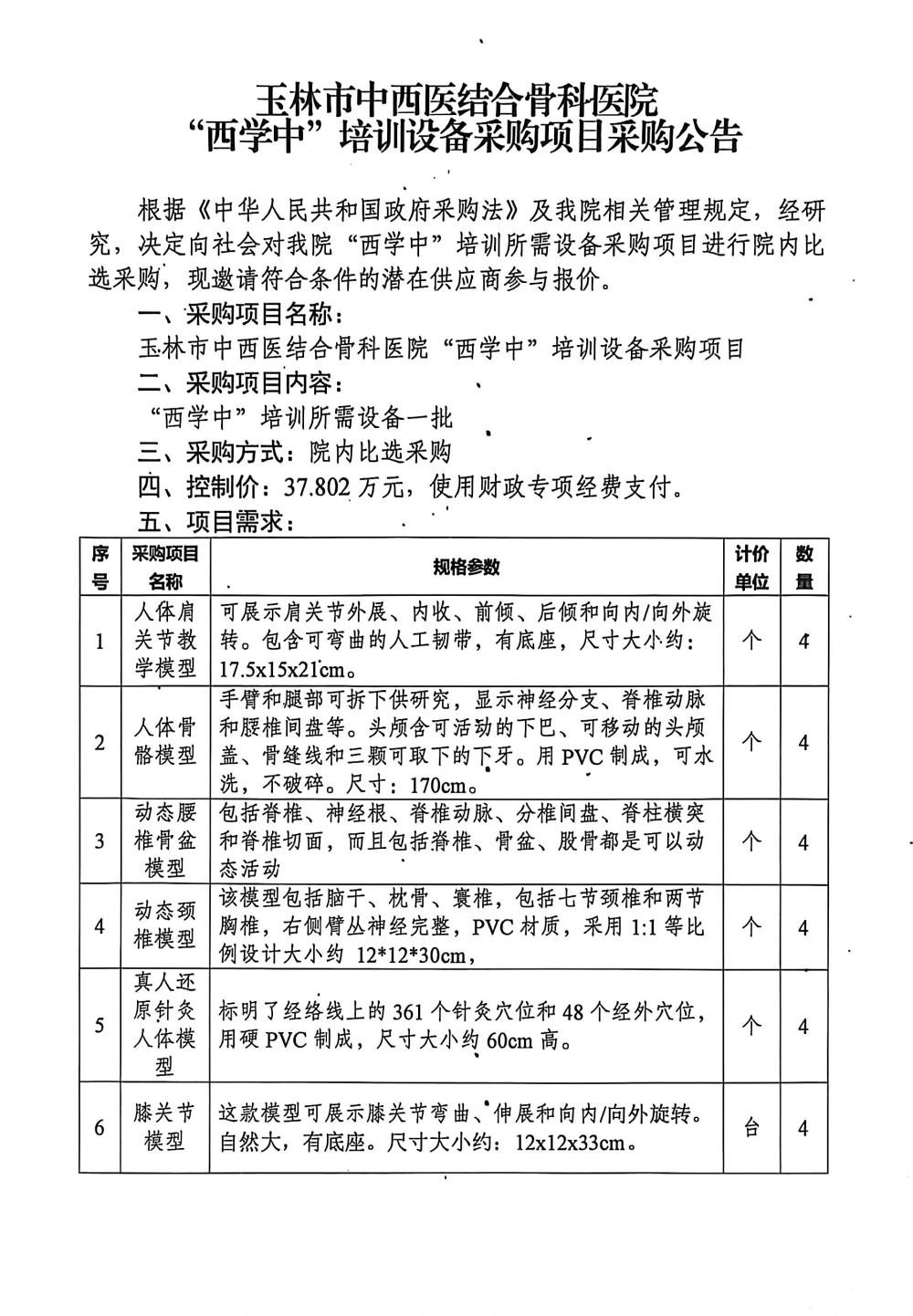 玉林市中西医结合骨科医院“西学中”培训设备采购项目公告