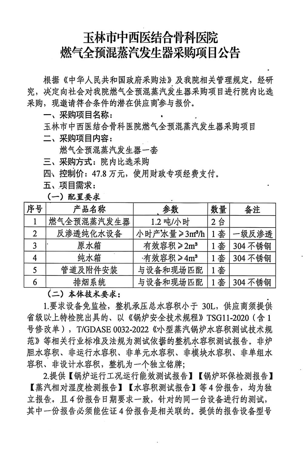 玉林市中西医结合骨科医院燃气全预混蒸汽发生器采购项目公告