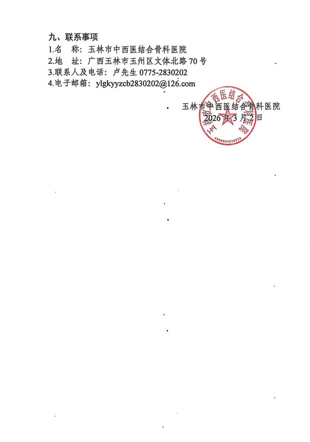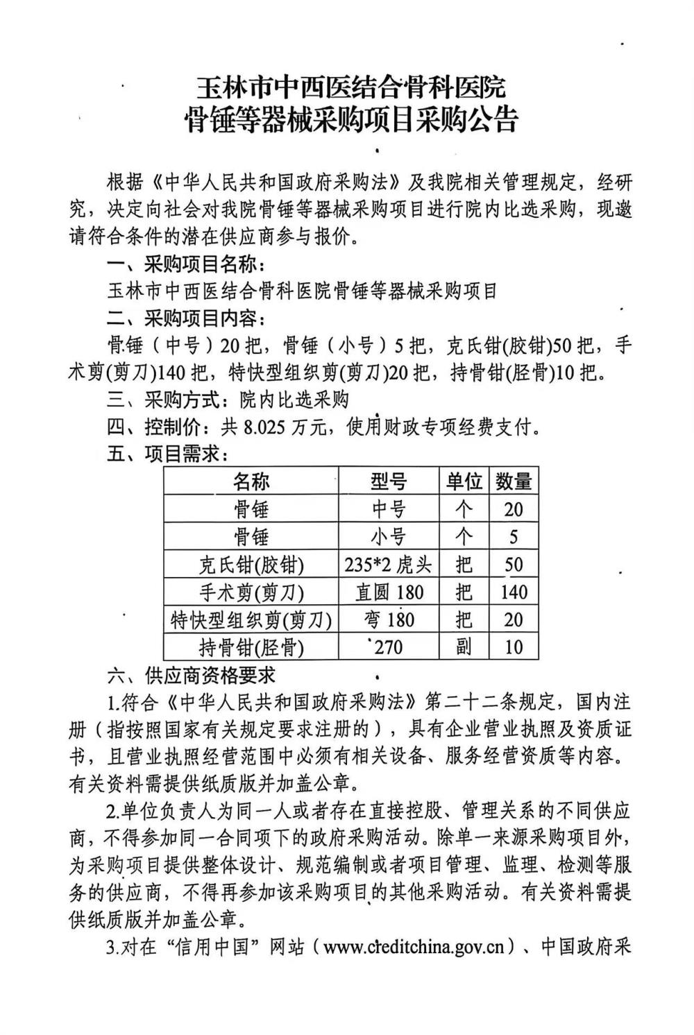玉林市中西医结合骨科医院骨锤等器械采购项目采购公告