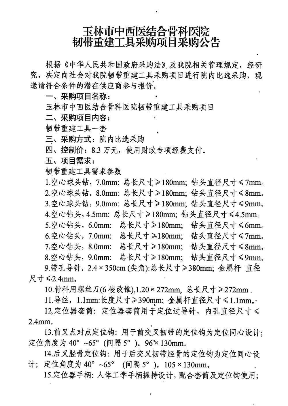 玉林市中西医结合骨科医院韧带重建工具采购项目采购公告