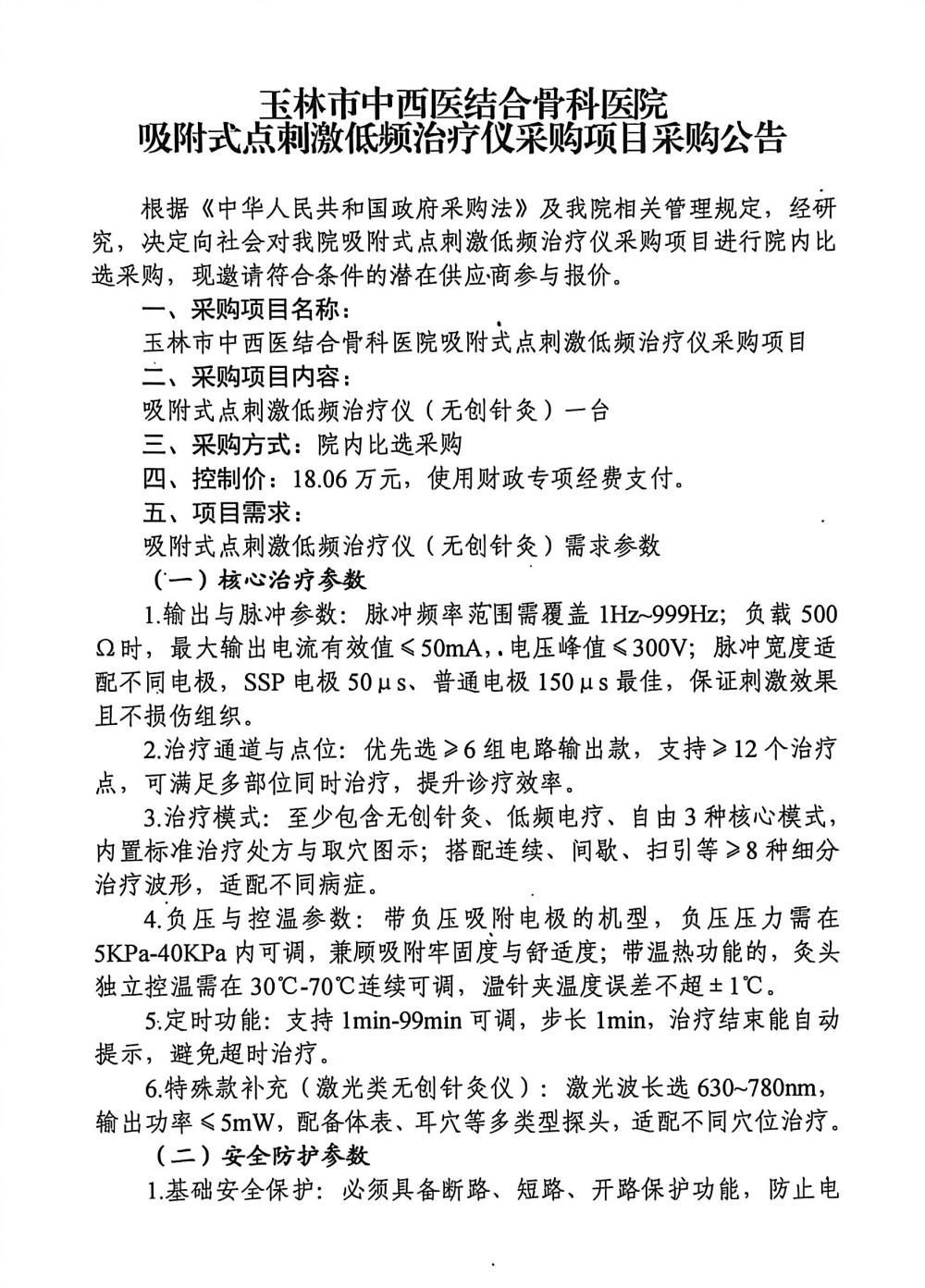 玉林市中西医结合骨科医院吸附式点刺激低频治疗仪采购项目采购公告
