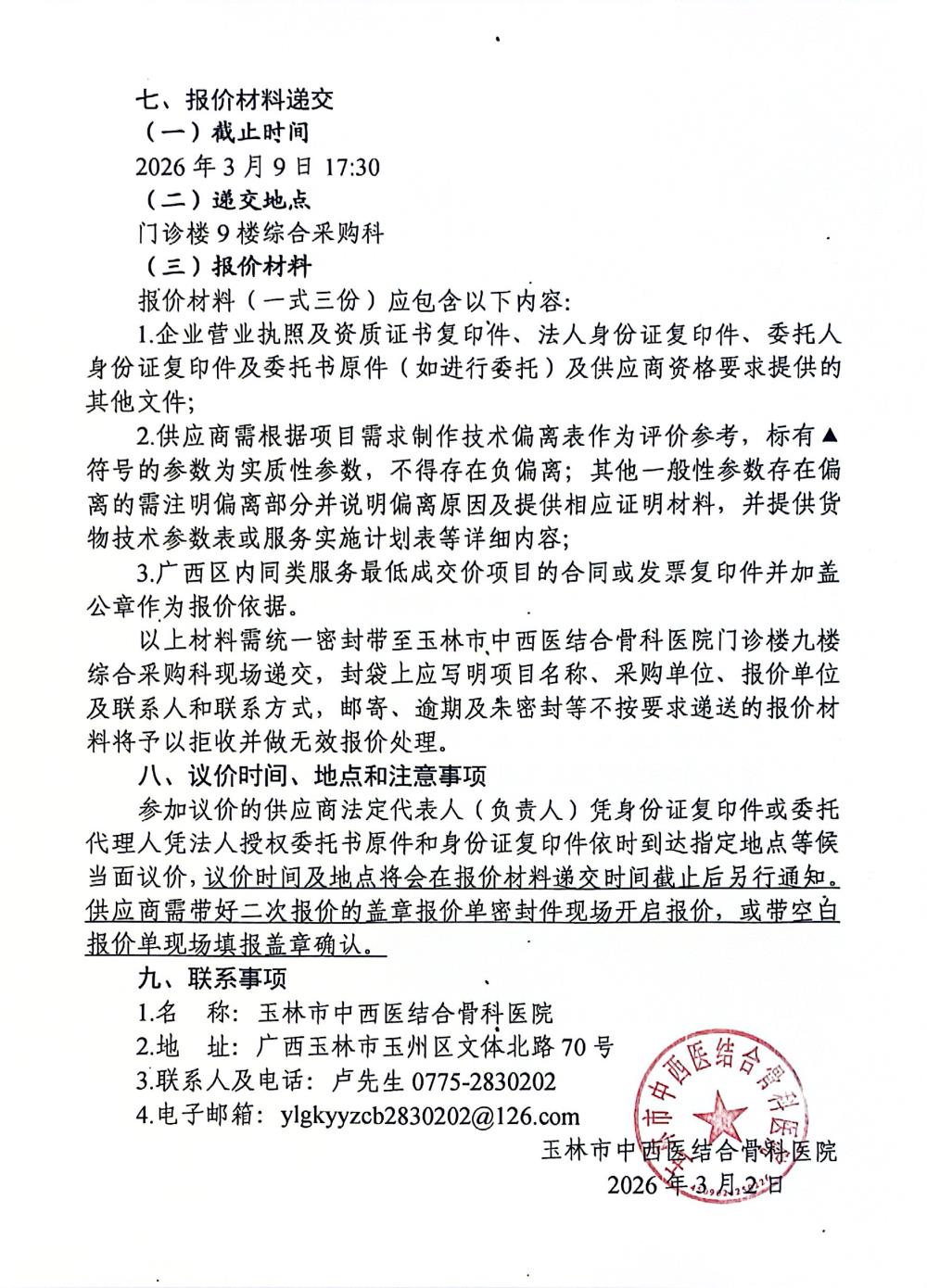 玉林市中西医结合骨科医院手术室器械采购项目采购公告