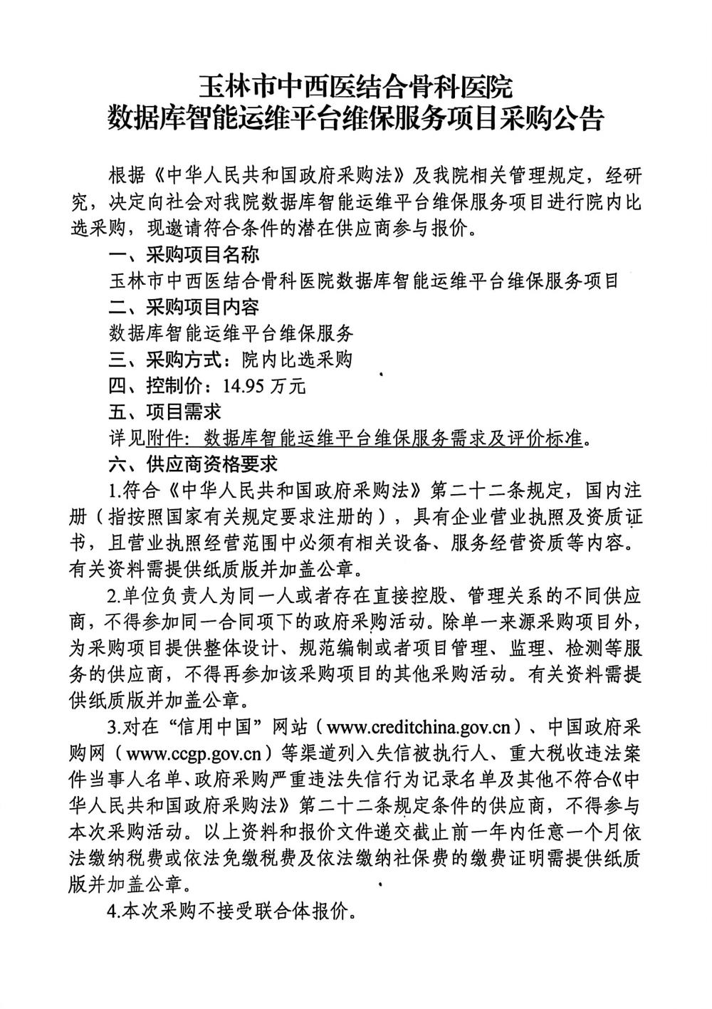 玉林市中西医结合骨科医院数据库智能运维平台维保服务项目采购公告