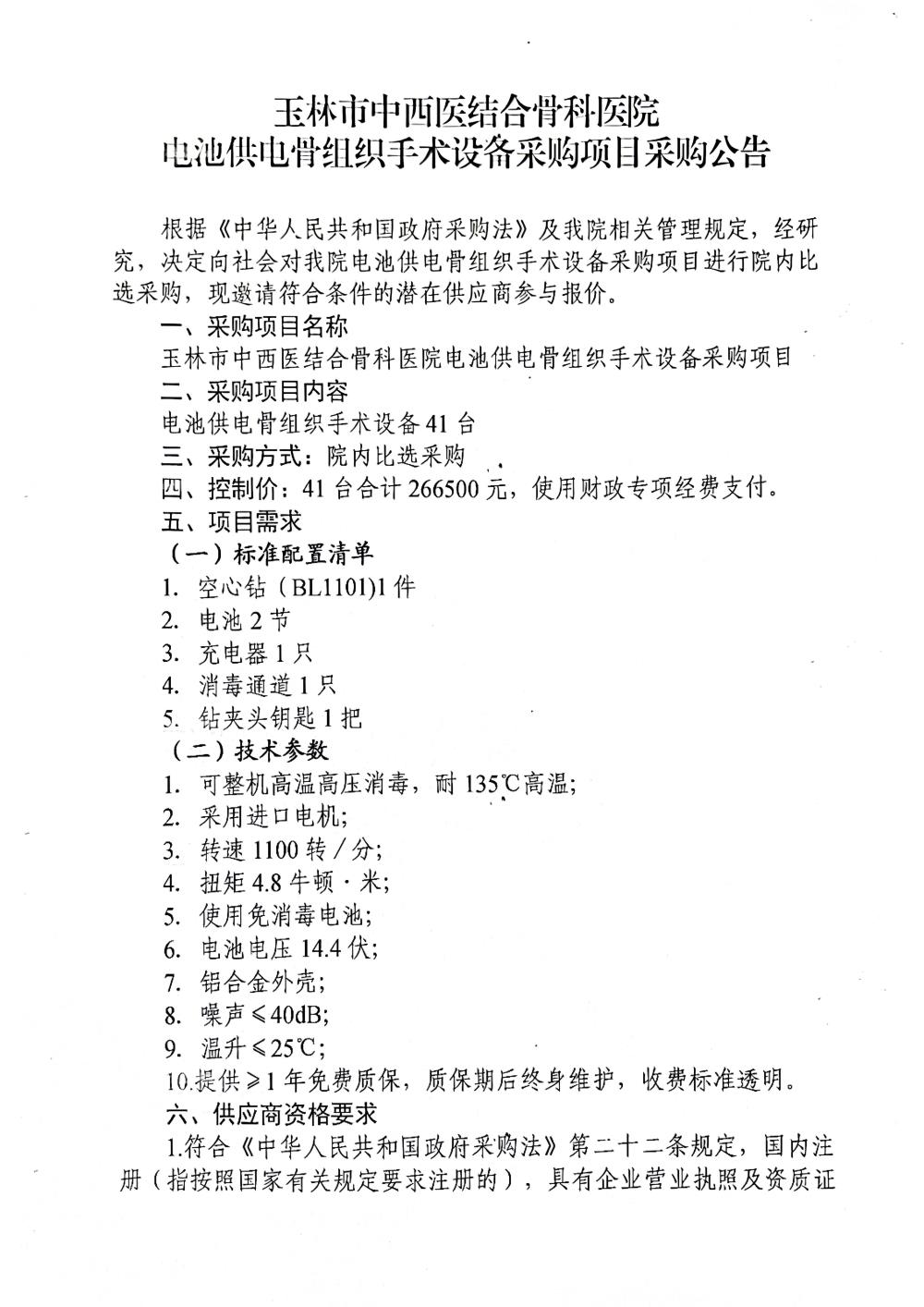 玉林市中西医结合骨科医院电池供电骨组织手术设备采购项目采购公告