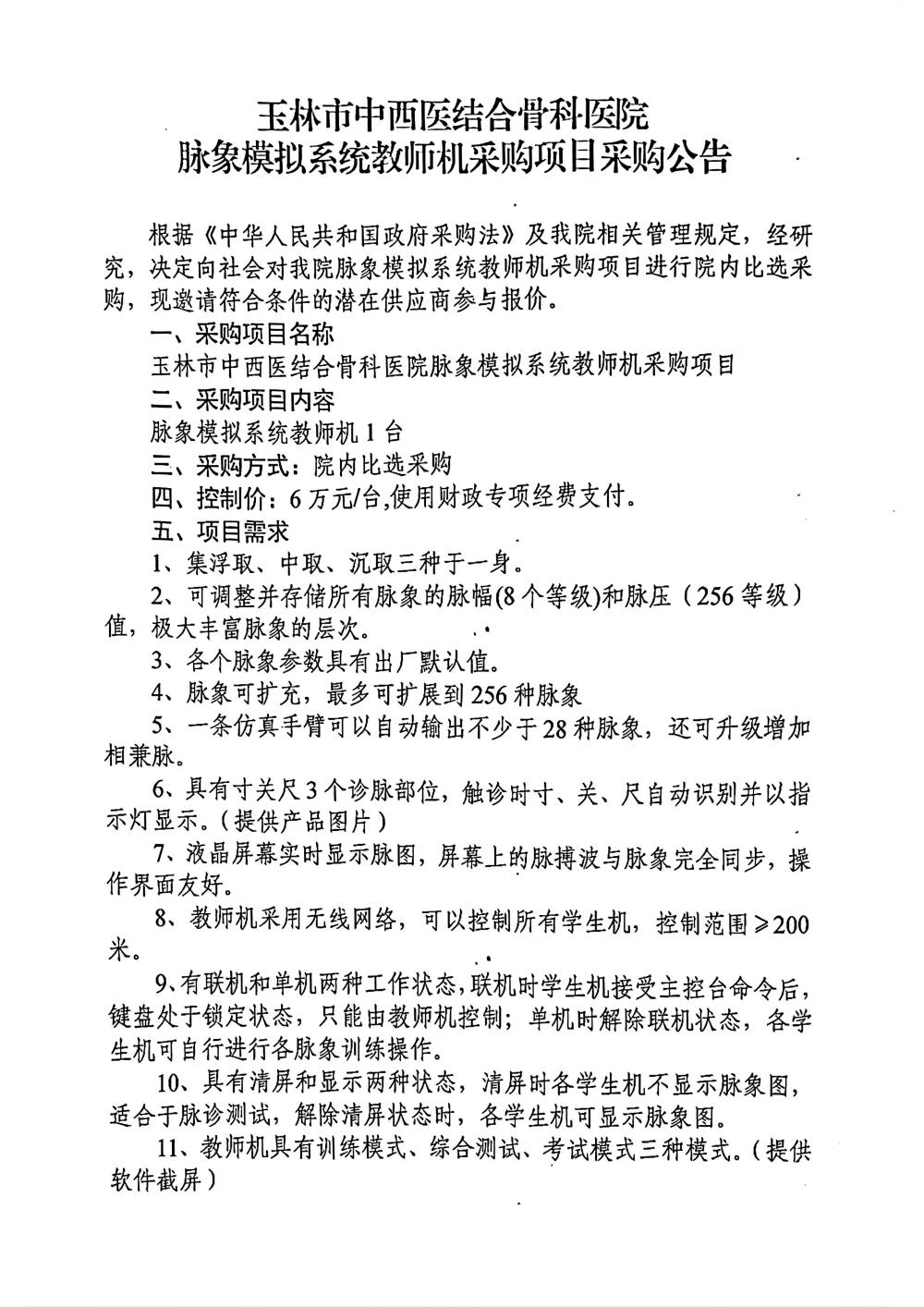 玉林市中西医结合骨科医院脉象模拟系统教师机采购项目采购公告