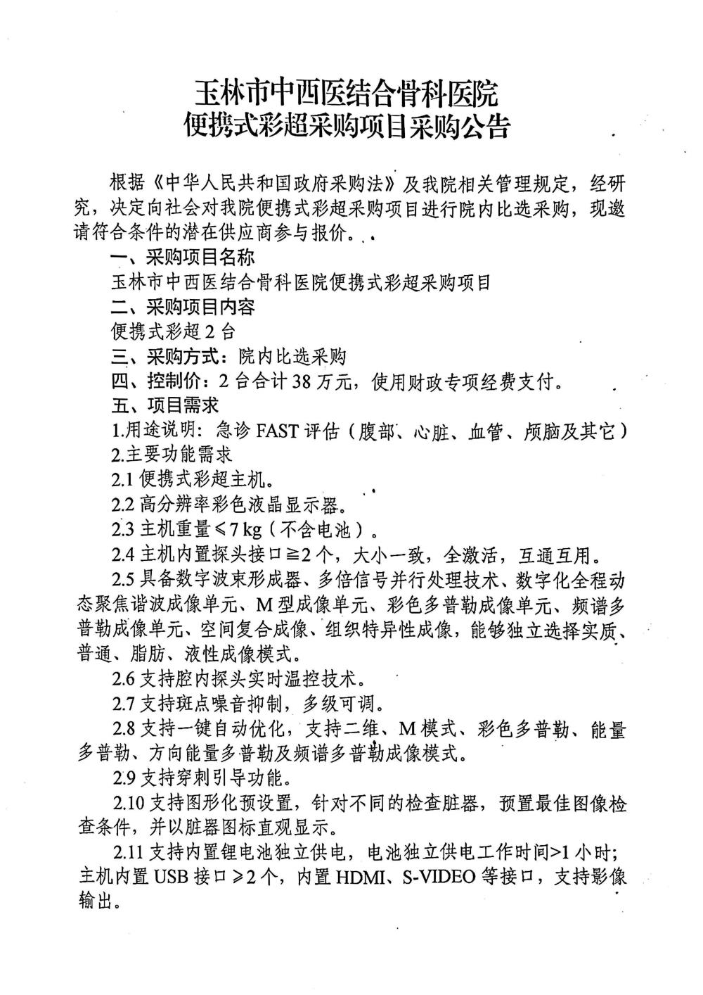 玉林市中西医结合骨科医院便携式彩超采购项目采购公告