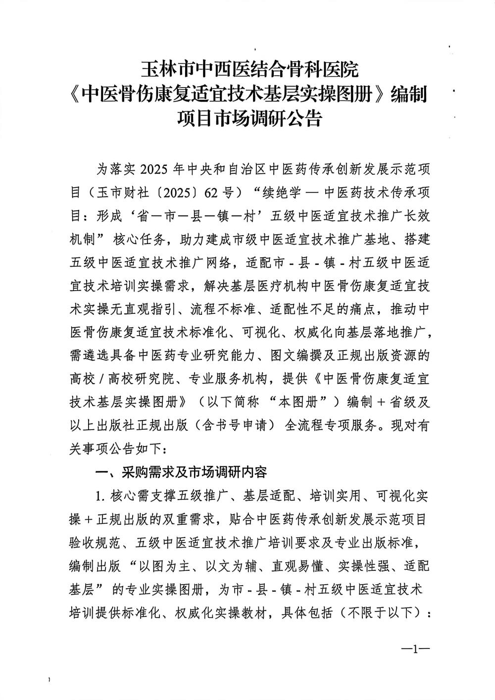 玉林市中西医结合骨科医院《中医骨伤康复适宜技术基层实操图册》编制项目市场调研公告