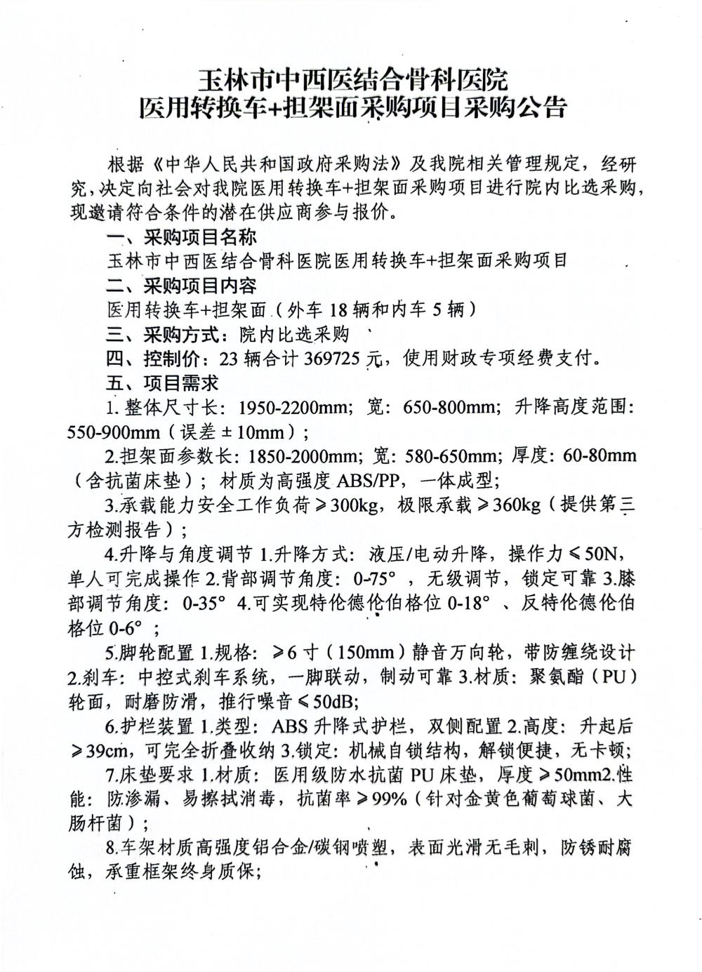 玉林市中西医结合骨科医院医用转换车+担架面采购项目采购公告