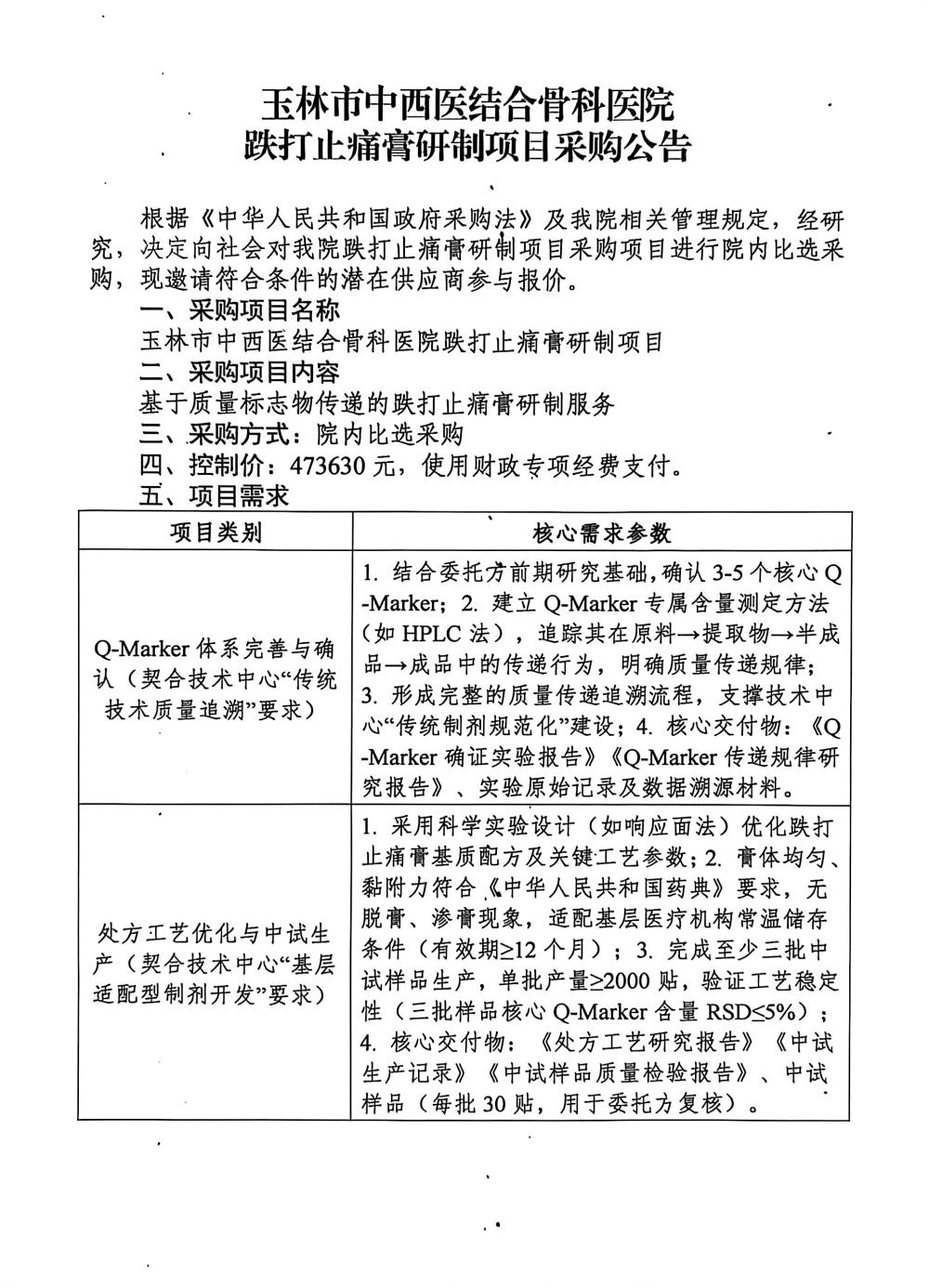 玉林市中西医结合骨科医院跌打止痛膏研制项目采购公告