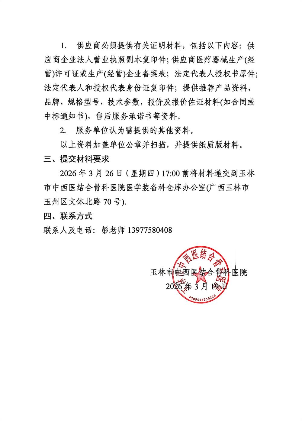 玉林市中西医结合骨科医院医疗设备维修市场调研问询公告