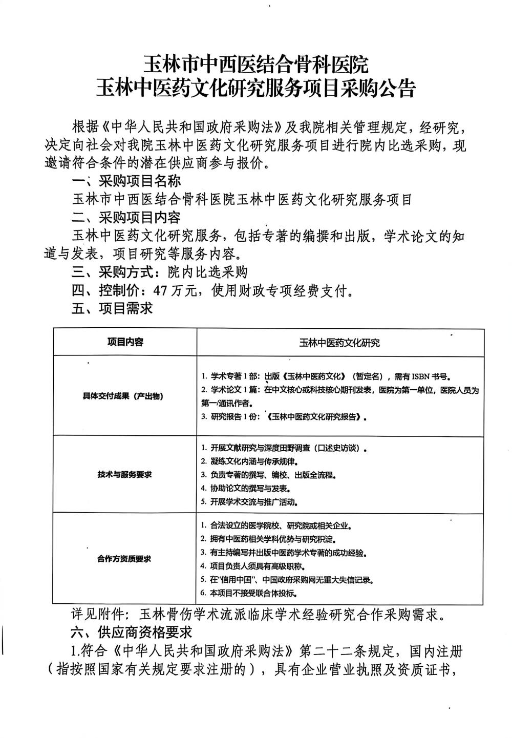 玉林市中西医结合骨科医院玉林中医药文化研究服务项目采购公告