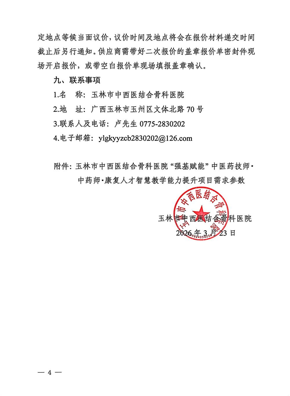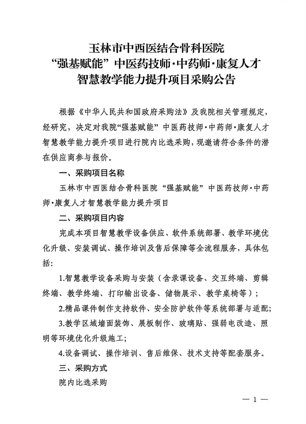 玉林市中西医结合骨科医院 “强基赋能”中医药技师•中药师•康复人才智慧教学能力提升项目采购公告