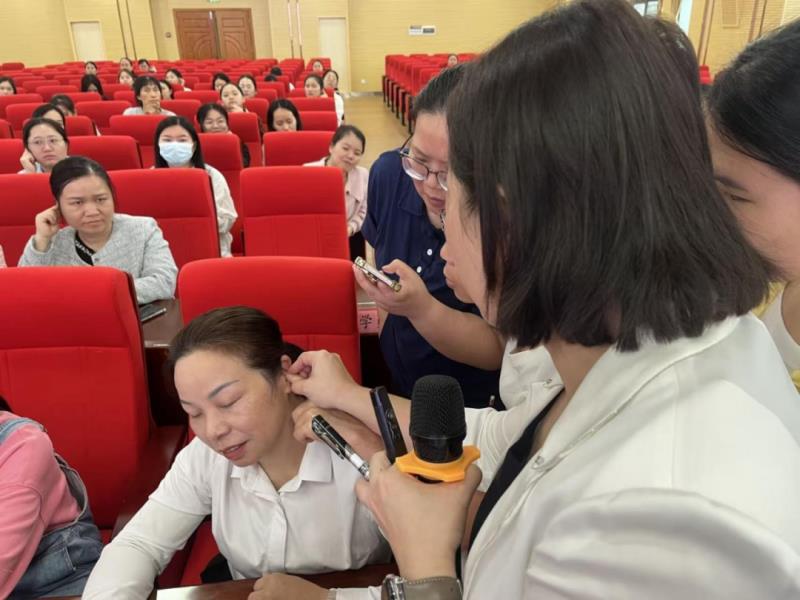 此次培训特邀广东省中医院贺海霞教授、广西中医药大学第一附属医院陈静教授及我院廖庆辉、杜俊毅教授组成专家团队授课。培训内容聚焦临床需求,分为两大板块:夯实中医理论与精研实操技术。中医理论重点讲解辨证论治与舌诊应用,掌握“观舌识证、辨证施护”能力。实操技术方面,传授火龙罐、耳穴疗法操作规范,其中,火龙罐疗法集推拿、刮痧、艾灸于一体,依据中医温通理论,借助特殊罐具的热力与手法,实现温经散寒、通络止痛之效;耳穴疗法则以全息理论为基础,通过刺激耳廓对应脏腑的反射点,调节气血阴阳平衡,达到防治疾病的目的。