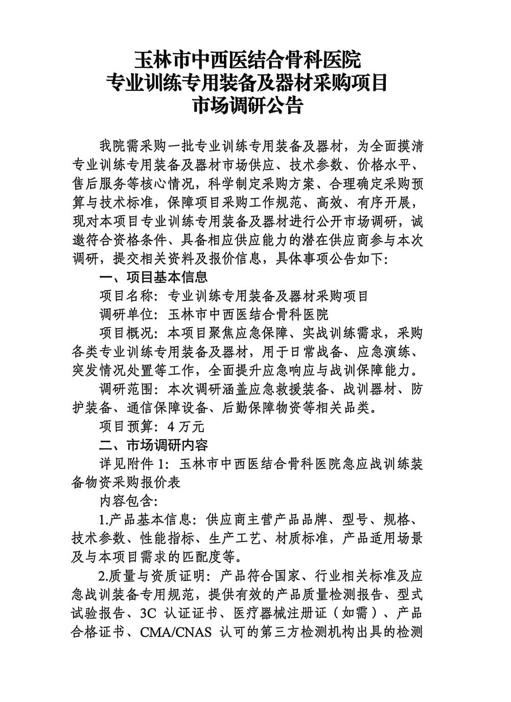 玉林市中西医结合骨科医院专业训练专用装备及器材采购项目市场调研公告