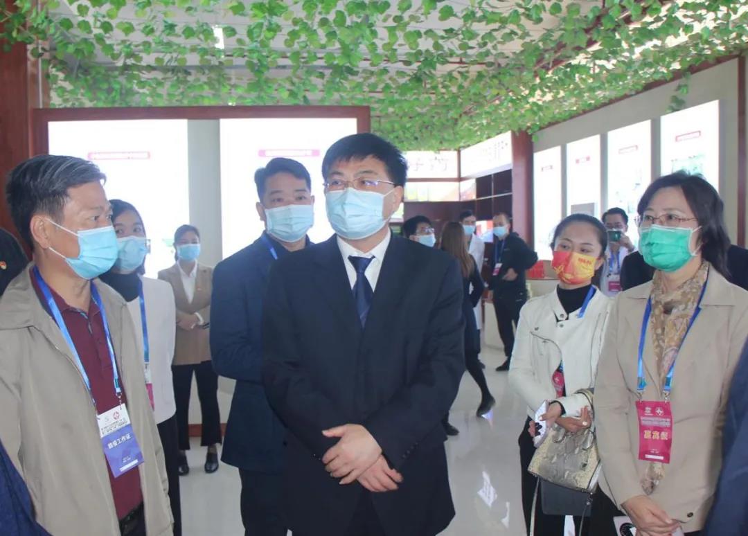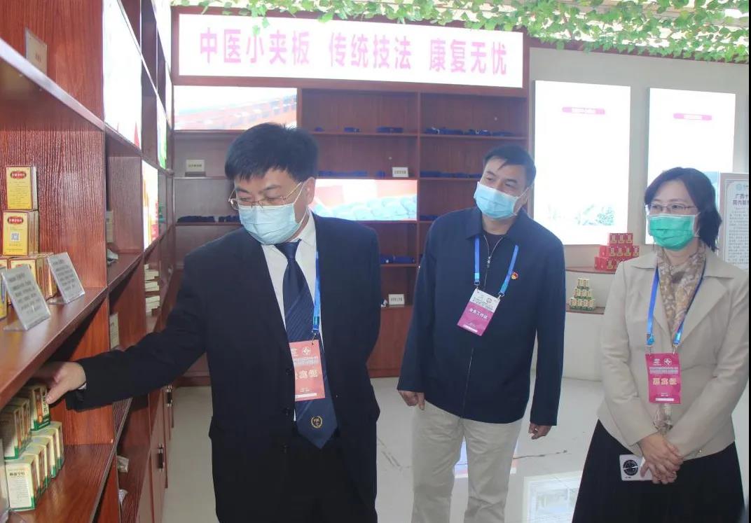 广西壮族自治区中医药管理局党组成员、副局长张玉军(中)广西中医药大学副校长冷静(右一)市卫生健康委副主任罗锡荣(左一)在展馆指导工作