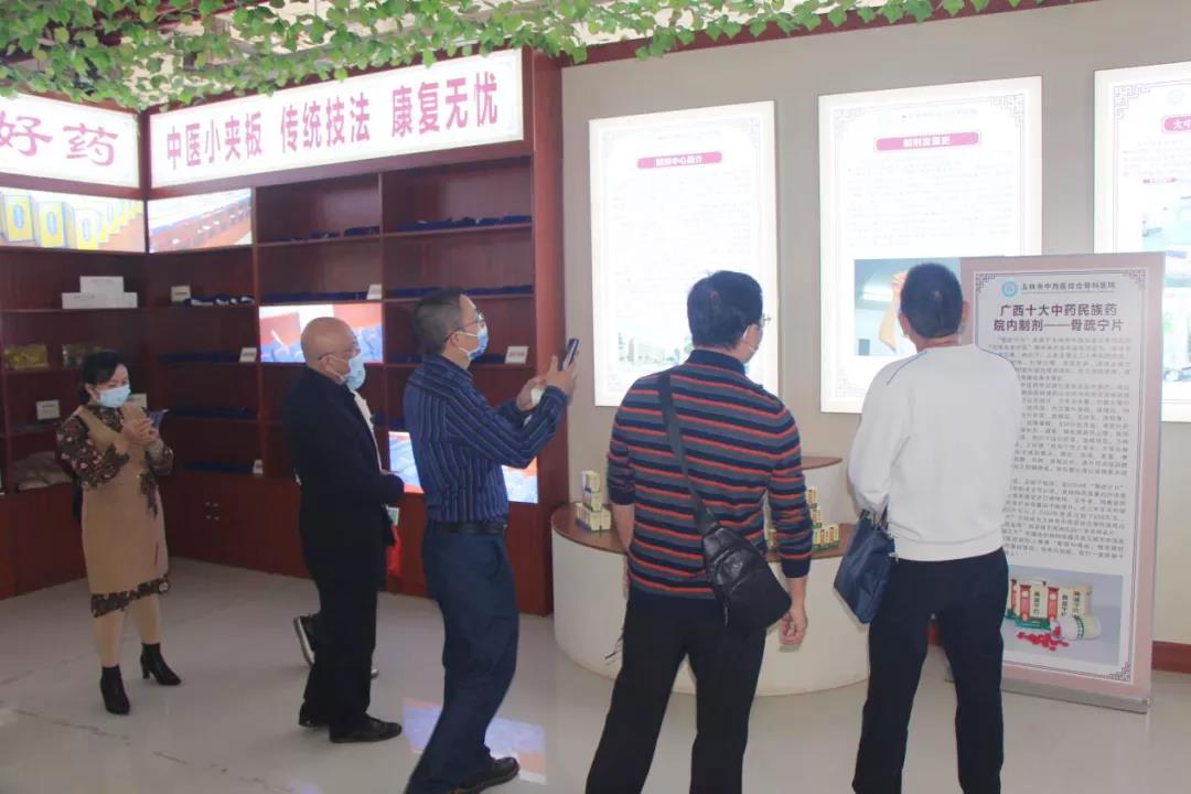 玉林市中西医结合骨科医院党委副书记吕广华(左三)陪同市卫生健康委人教科科长刘润红(左二)市卫生监督所陈成旺科长参观骨伤技术体验区