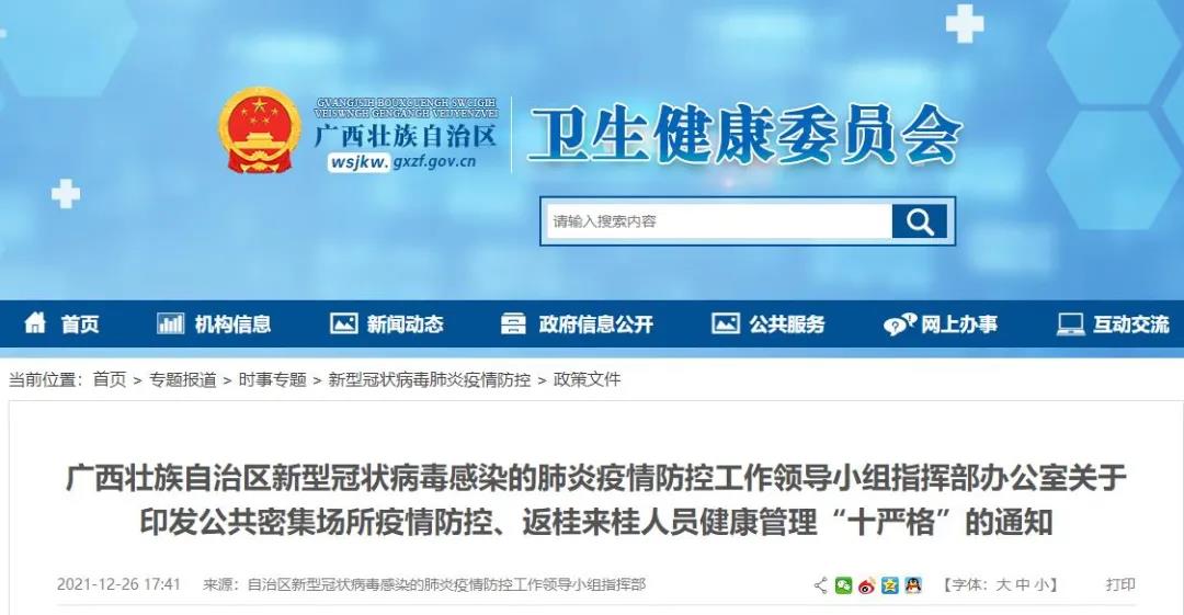 官网截图 为进一步做好广西“外防输入、内防反弹”疫情防控各项工作,加强公共密集场所、返桂来桂人员疫情防控,现将公共密集场所疫情防控、返桂来桂人员健康管理“十严格”措施印发给你们,请结合实际,广泛宣传,并迅速贯彻落实到位,做到知晓全覆盖、行动全覆盖。 公共密集场所疫情防控“十严格”