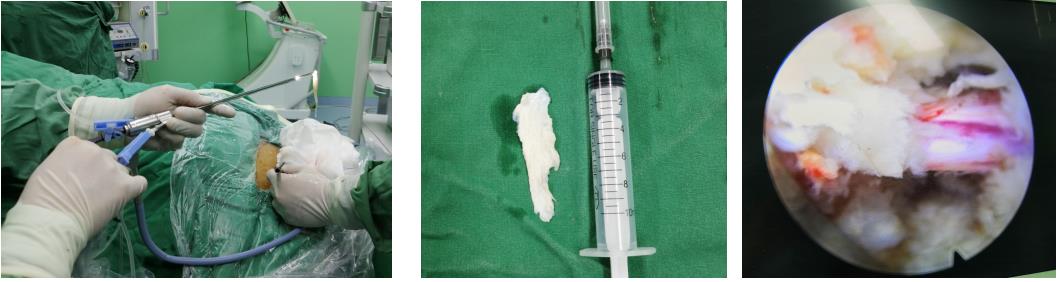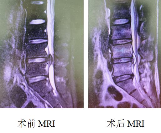 微创脊柱外科技术的开展对患者创伤小、痛苦少、恢复快、疗效佳、并发症少、费用低,操作精确度高、效果肯定、术后功能恢复快。我科近年来在微创脊柱领域也进行了深入的学习、探讨,并积极开展各项微创脊柱治疗技术,取得了良好的临床效果。病例 腰4/5椎间盘突出,行经皮穿刺经椎间孔镜下髓核摘除手术。术前:腰4/5椎间盘变性突出,部分髓核组织脱出椎管内。术后:突出及游离椎间盘髓核组织已摘除,椎管容积恢复。