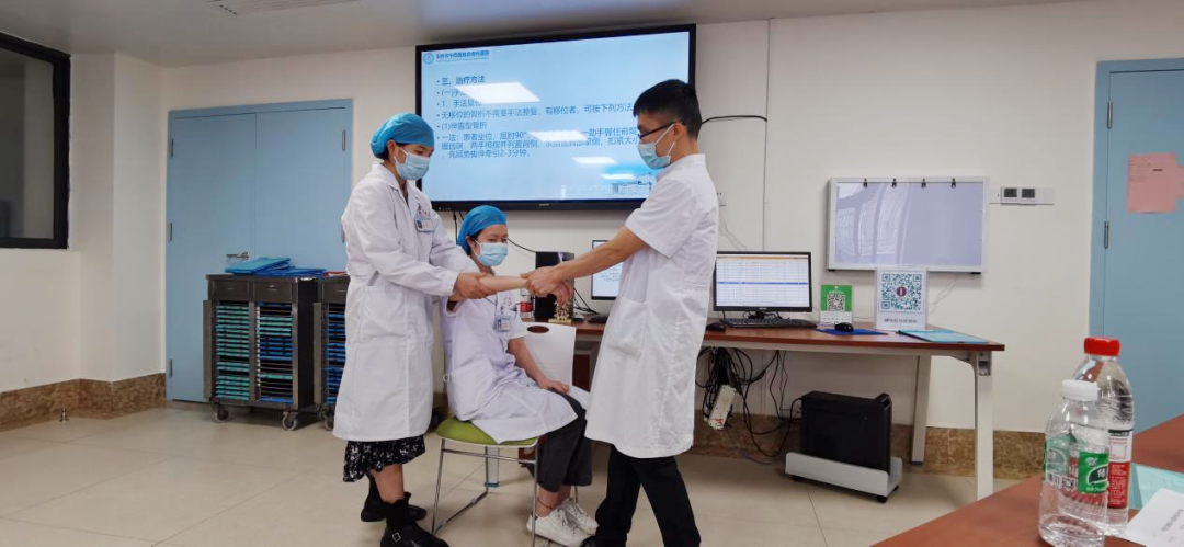 ▲现场演示并指导中医住培学员常见骨折手法复位及夹板固定