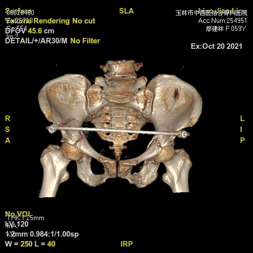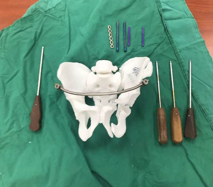 3D打印技术能重建骨盆骨折的三维模型(1:1模型),从任意角度观察骨折情况,并通过三维编辑功能对骨盆模型进行骨折块分离、旋转、移位等操作,推测其暴力机制,更能进行模拟复位、规划手术。利用3D打印骨盆模型模拟手术,预弯接骨板及设计螺钉置入方向、测量螺钉长度,可缩短手术时间,减少出血量,同时可以在复位过程中使用预先折弯的接骨板于骨面的贴合程度检验骨折的复位情况,减少术中透视次数及X线照射剂量,实现骨盆骨折精准手术。