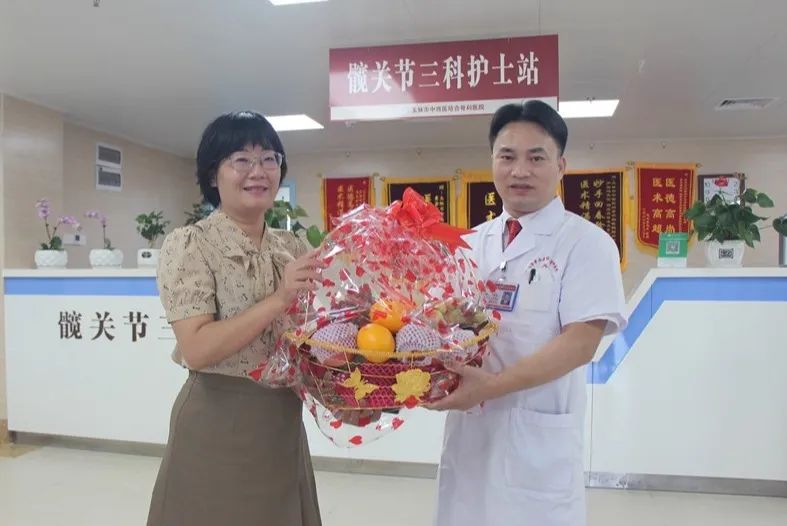 8月19日上午,玉林市卫生健康委员会杨媚副主任一行来到我院慰问临床一线医师,为医务人员送上慰问品,并祝福大家节日快乐。杨媚副主任说,医生是人民健康的守护者,责任重大,使命光荣,希望广大医务工作者切实履行好救死扶伤的社会职责,潜心钻研医术,充分利用贵院的专业特色和技术优势,为医疗卫生事业做出更大贡献。
