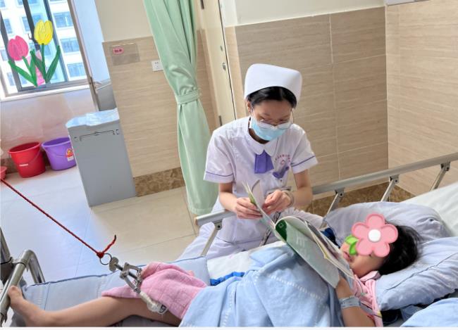 02护理关爱篇矫形骨科护理人员在徐德霞护士长的带领下给予患儿常规护理,护理爱心小组还根据欣欣的个体情况,开展人文关怀活动。欣欣年龄小,又需要长期卧床,加上此类病症也可能在一定程度上导致患儿心理上恐惧行走,担心被他人笑话,产生一系列心理问题,针对这些情况爱心小组会给予心理疏导,鼓励小欣欣将积压的负面情绪释放出来,通过家人和医护人员的陪伴和鼓励,获得更多的安全感。同时科室内的护士姐姐还会抽空陪同小欣欣一起阅读绘本故事,经常与她轻松愉快的聊天,小欣欣逐渐变得开朗起来,家长的眉梢也渐渐舒展开来。