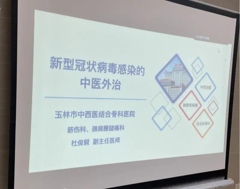 筋伤科负责人杜俊毅主任介绍了新冠感染的中医外治方法,针刺、艾灸、穴位贴敷、拔罐、推拿等均对调整机体状态,提升正气有较好的疗效,保证各专科医护人员切实掌握中医诊疗技术。