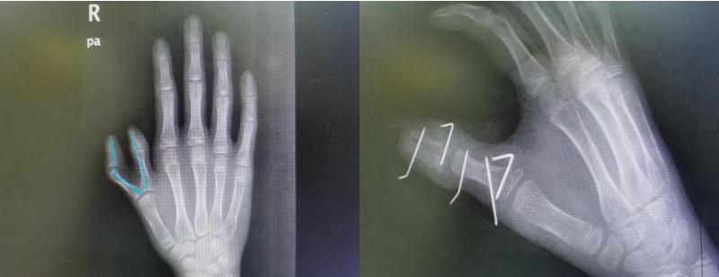 根据术前设计,切除多余皮肤组织,截除多余骨质,指骨、关节及指甲成形,然后将两畸形指拼接在一起,使用克氏针固定,修复甲床……